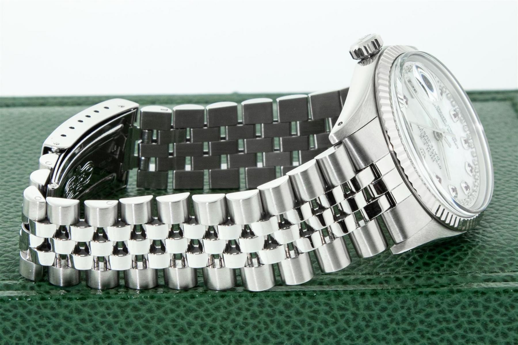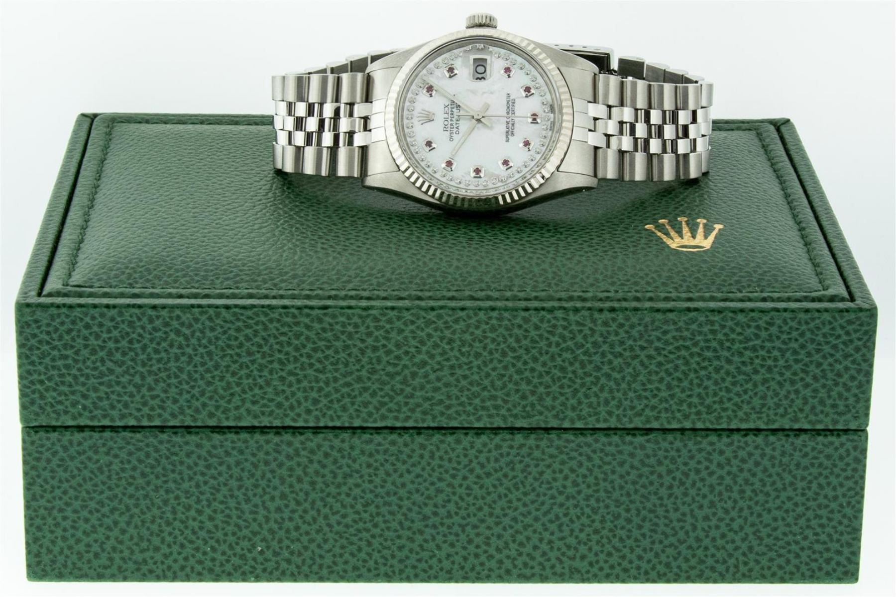 One Mens Stainless Steel Rolex Datejust Polished Bright with Satin Finish, Serviced & Electronically Tested, Stainless Steel Case: 36mm, Stainless Steel Crown, Original Bezel: White Gold Fluted Bezel. Custom Crystal: New Acrylic Cyclops Lens. Custom Hands: New Luminescent Hands. Movement: Automatic Winding Movement.. Custom Dial: Mother Of Pearl Ruby String Diamond Dial, Stone Count: 10 Rubies + 48 Diamonds in Dial, G To H In Color, SI-VS Clarity. Date Window: 3 O'Clock Position Date Display, Quickset, Model: Datejust, Condition: G-6 Extra Fine. Bracelet: Stainless Steel Jubilee. Bright Polish & Satin Finish. 7.0 Inch Length, Adjustable. Standard Clasp, With Rolex Logo. Watch Has Been Serviced And Polished It Is Free Of All Scratches And Dents. This Watch Comes With A Rolex Box.