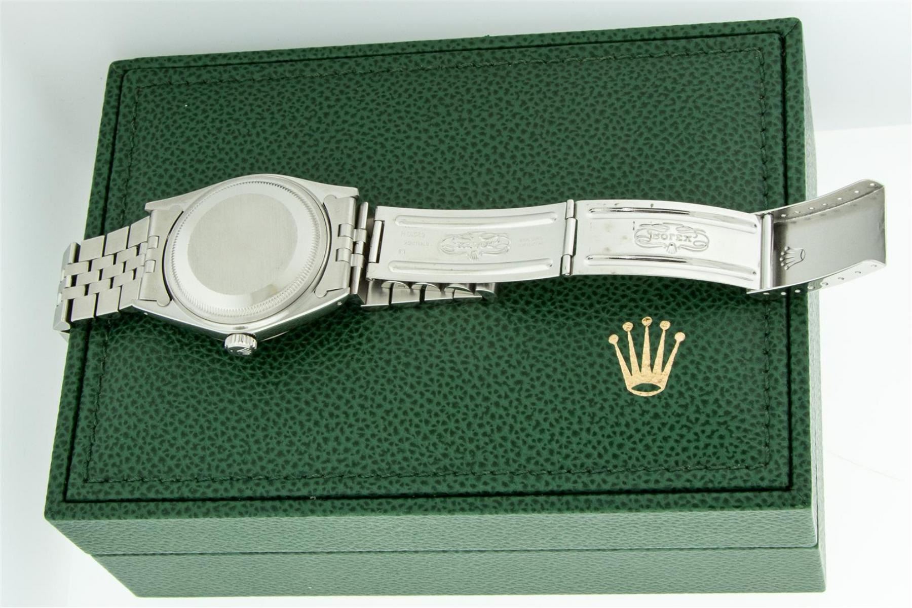 One Mens Stainless Steel Rolex Datejust Polished Bright with Satin Finish, Serviced & Electronically Tested, Stainless Steel Case: 36mm, Stainless Steel Crown, Original Bezel: White Gold Fluted Bezel. Custom Crystal: New Acrylic Cyclops Lens. Custom Hands: New Luminescent Hands. Movement: Automatic Winding Movement.. Custom Dial: Mother Of Pearl Ruby String Diamond Dial, Stone Count: 10 Rubies + 48 Diamonds in Dial, G To H In Color, SI-VS Clarity. Date Window: 3 O'Clock Position Date Display, Quickset, Model: Datejust, Condition: G-6 Extra Fine. Bracelet: Stainless Steel Jubilee. Bright Polish & Satin Finish. 7.0 Inch Length, Adjustable. Standard Clasp, With Rolex Logo. Watch Has Been Serviced And Polished It Is Free Of All Scratches And Dents. This Watch Comes With A Rolex Box.