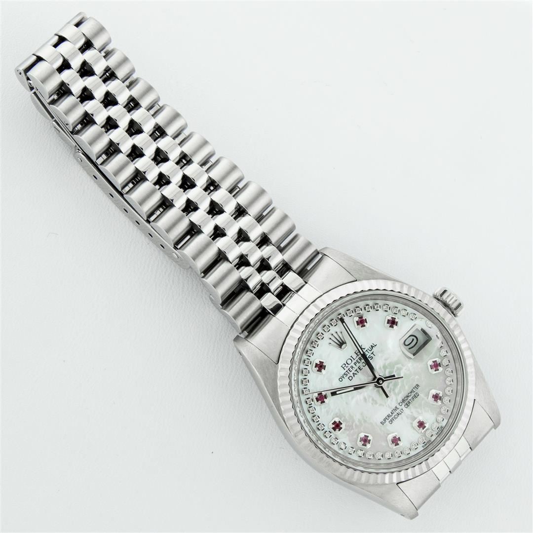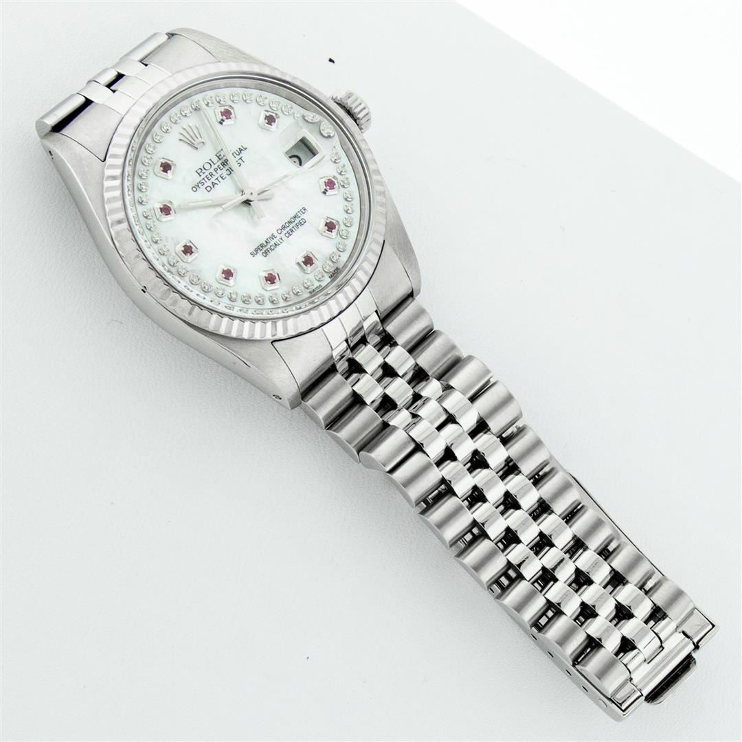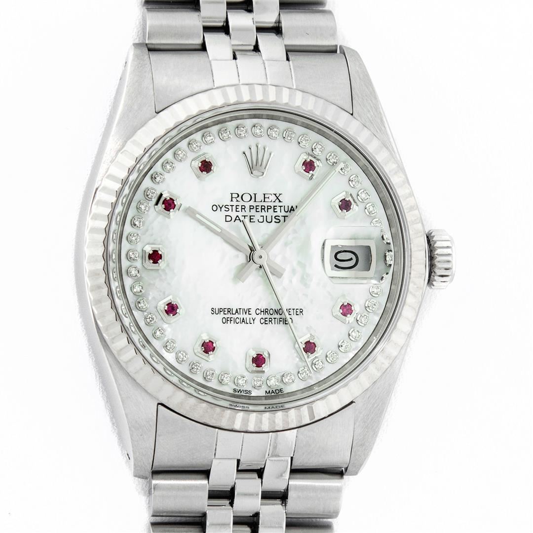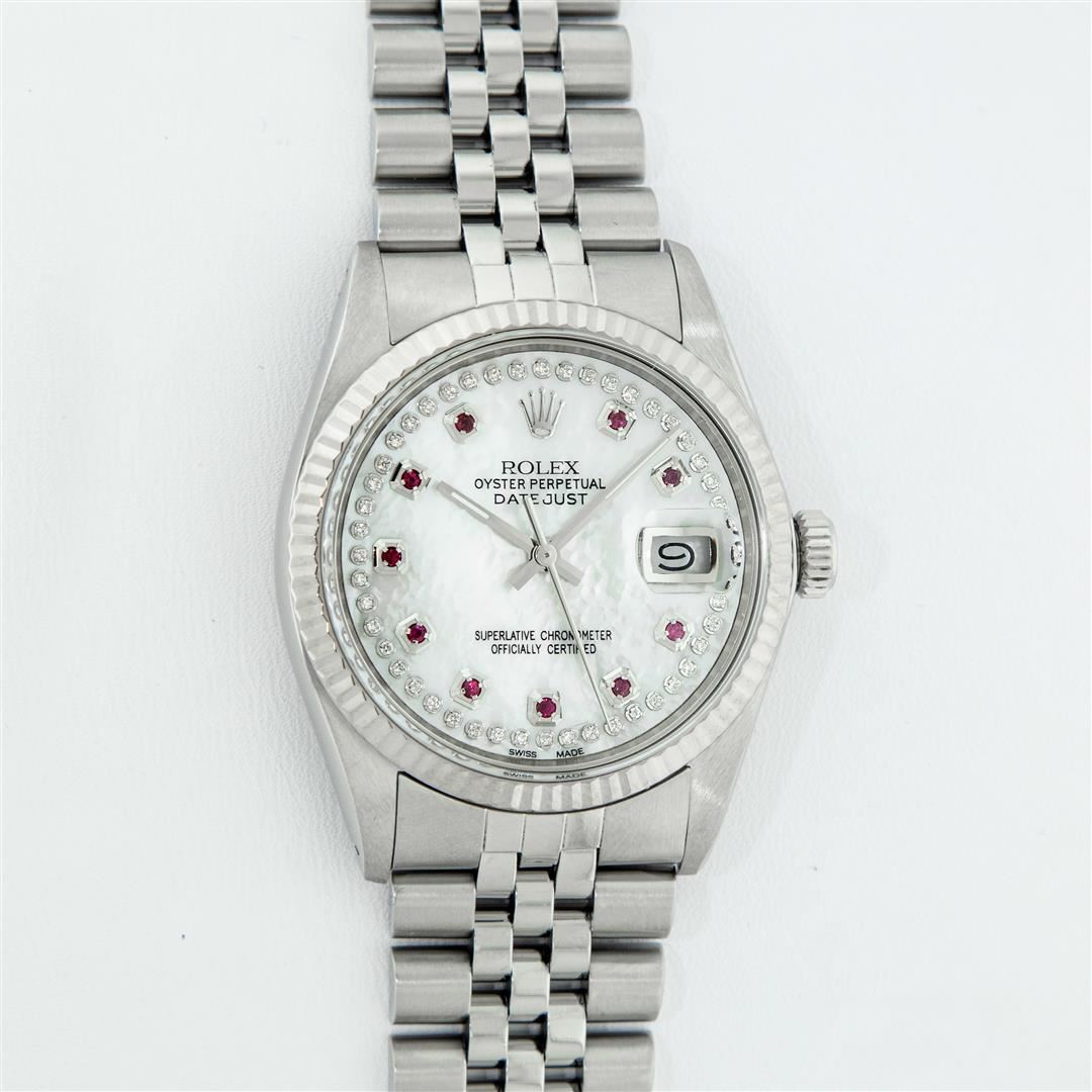 One Men's Stainless Steel Rolex Datejust Polished Bright with Satin Finish, Serviced & Electronically Tested, Stainless Steel Case: 36mm, Stainless Steel Crown, Original Bezel: 14K White Gold Fluted Bezel. Custom Crystal: New Acrylic Cyclops Lens. Custom Hands: New Luminescent Hands. Movement: Automatic Winding Movement Caliber 3035. Custom Dial: Mother Of Pearl Ruby String Diamond Dial, Stone Count: 10 Rubies + 48 Diamonds On Dial, G To H In Color, SI-VS Clarity. Date Window: 3 O'Clock Position Date Display, Quickset, Model: Datejust, Condition: G-6 Extra Fine. Bracelet: Stainless Steel Jubilee. Bright Polish & Satin Finish.�7.0 Inch Length, Adjustable. Standard Clasp, With Rolex Logo. Watch Has Been Serviced And Polished It Is Free Of All Scratches And Dents.
