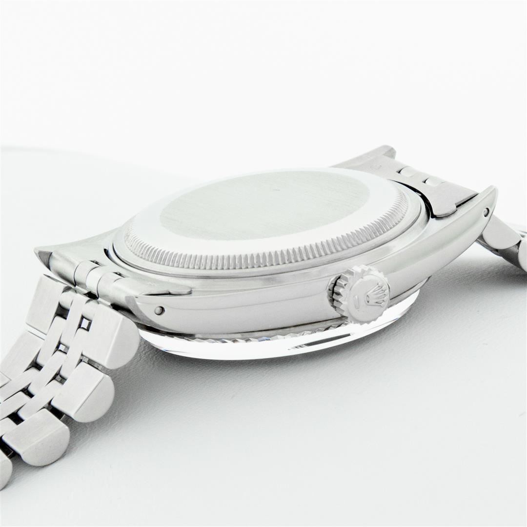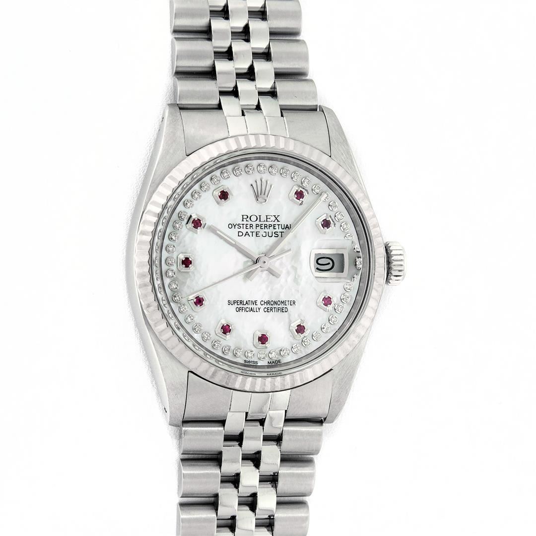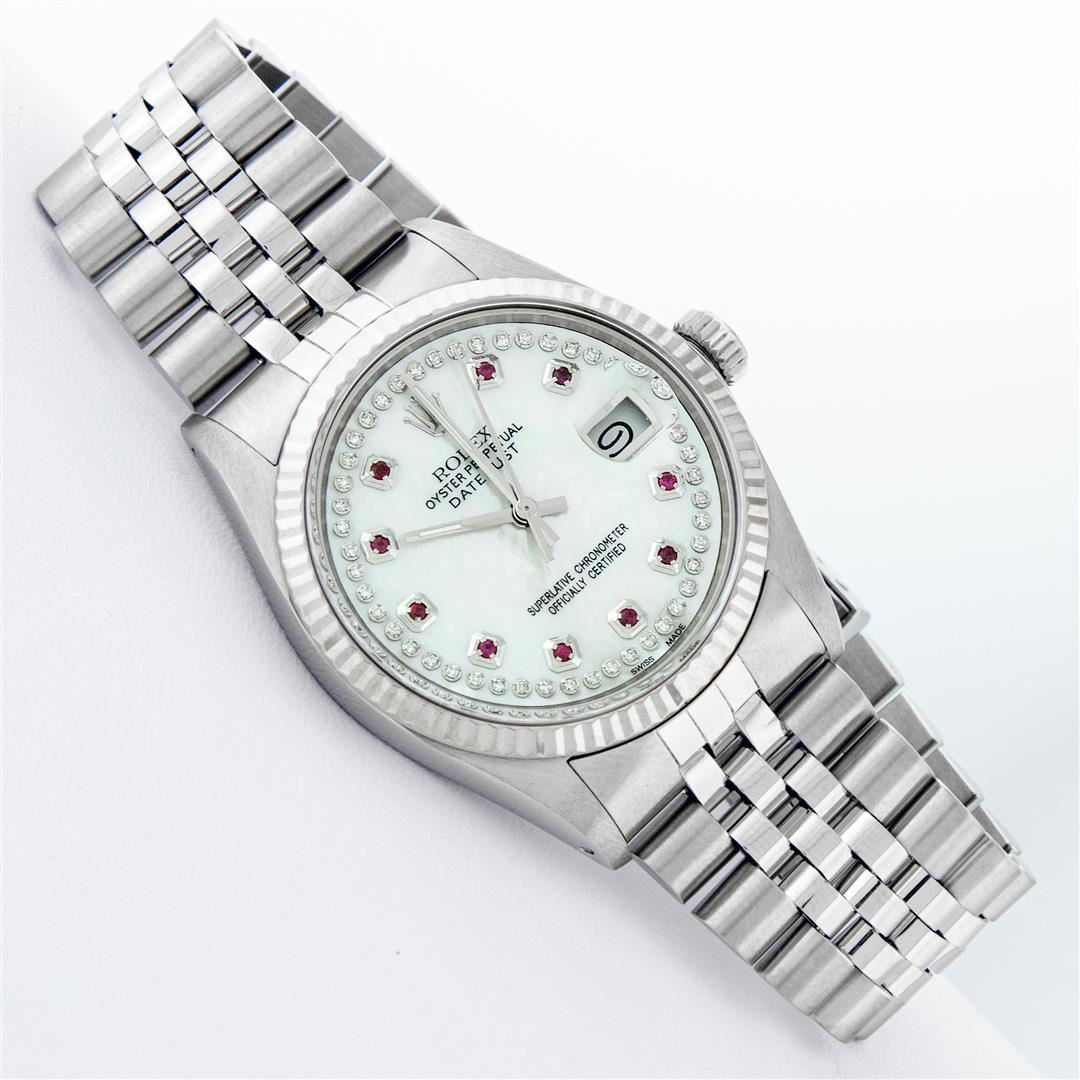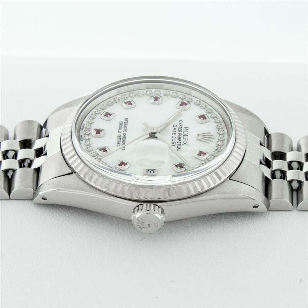 One Men's Stainless Steel Rolex Datejust Polished Bright with Satin Finish, Serviced & Electronically Tested, Stainless Steel Case: 36mm, Stainless Steel Crown, Original Bezel: 14K White Gold Fluted Bezel. Custom Crystal: New Acrylic Cyclops Lens. Custom Hands: New Luminescent Hands. Movement: Automatic Winding Movement Caliber 3035. Custom Dial: Mother Of Pearl Ruby String Diamond Dial, Stone Count: 10 Rubies + 48 Diamonds On Dial, G To H In Color, SI-VS Clarity. Date Window: 3 O'Clock Position Date Display, Quickset, Model: Datejust, Condition: G-6 Extra Fine. Bracelet: Stainless Steel Jubilee. Bright Polish & Satin Finish.�7.0 Inch Length, Adjustable. Standard Clasp, With Rolex Logo. Watch Has Been Serviced And Polished It Is Free Of All Scratches And Dents.