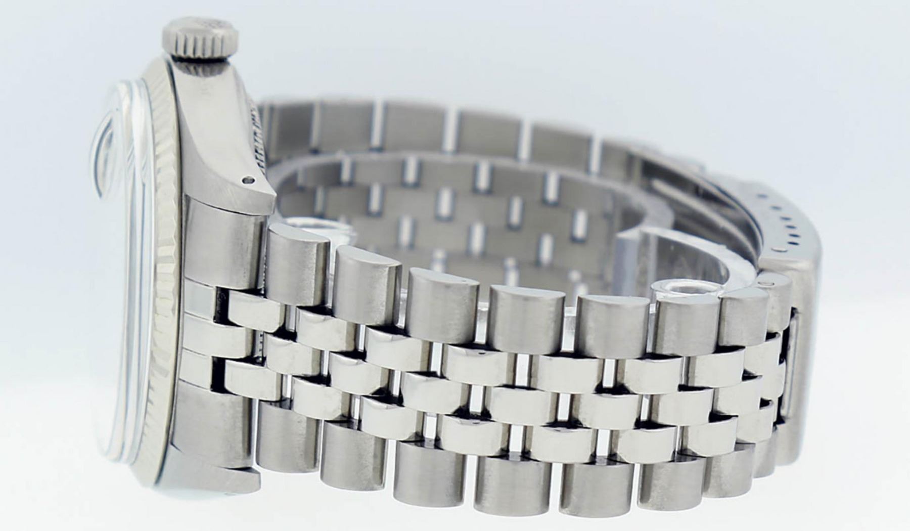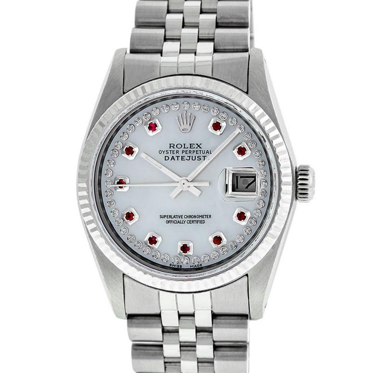 One Mens Stainless Steel Rolex Datejust Polished Bright with Satin Finish, Serviced & Electronically Tested, Stainless Steel Case: 36mm, Stainless Steel Crown, Original Bezel: 14K White Gold Fluted Bezel. Custom Crystal: New Acrylic Cyclops Lens. Custom Hands: New Luminescent Hands. Movement: Automatic Winding Movement Caliber 3035. Custom Dial: Mother Of Pearl Ruby String Diamond Dial, Stone Count: 10 Rubies + 48 Diamonds in Dial, G To H In Color, SI-VS Clarity. Date Window: 3 O'Clock Position Date Display, Quickset, Model: Datejust, Condition: G-6 Extra Fine. Bracelet: Stainless Steel Jubilee. Bright Polish & Satin Finish.�7.0 Inch Length, Adjustable. Standard Clasp, With Rolex Logo. Watch Has Been Serviced And Polished It Is Free Of All Scratches And Dents.