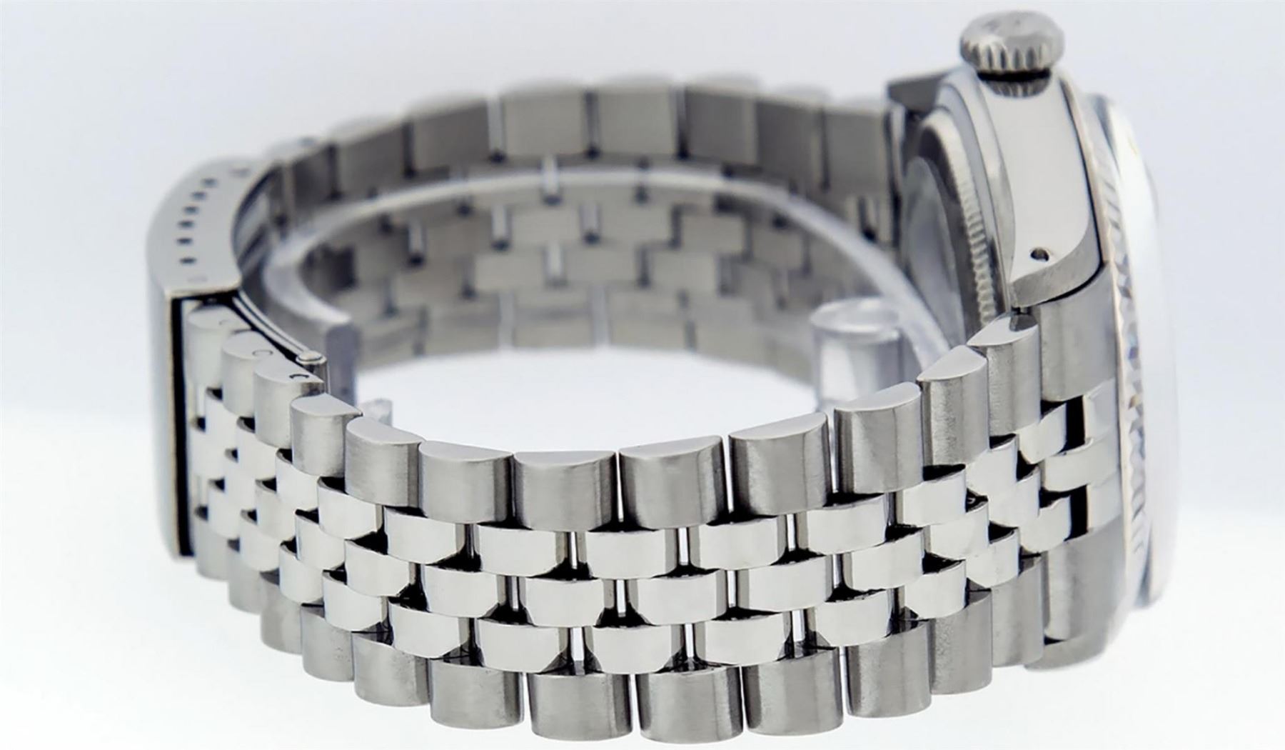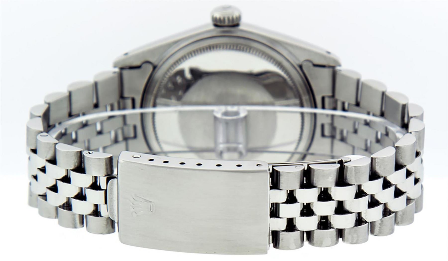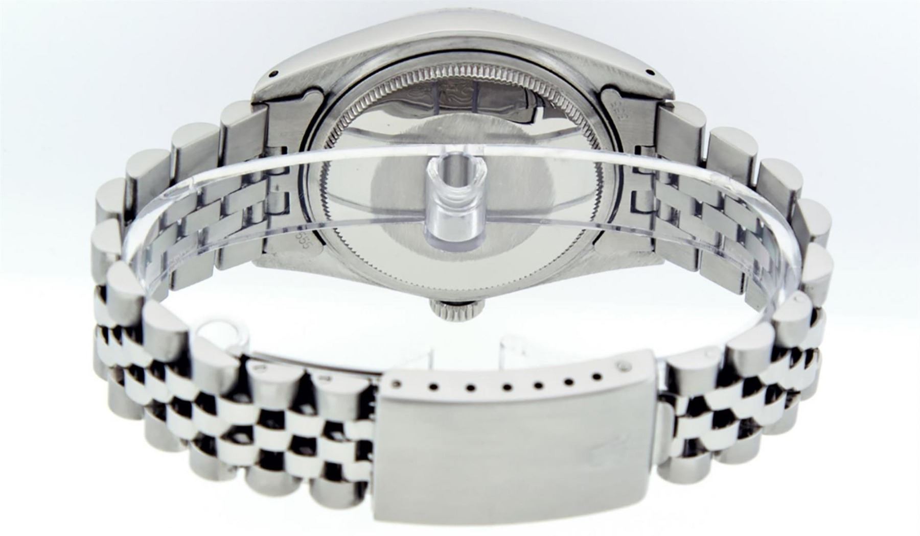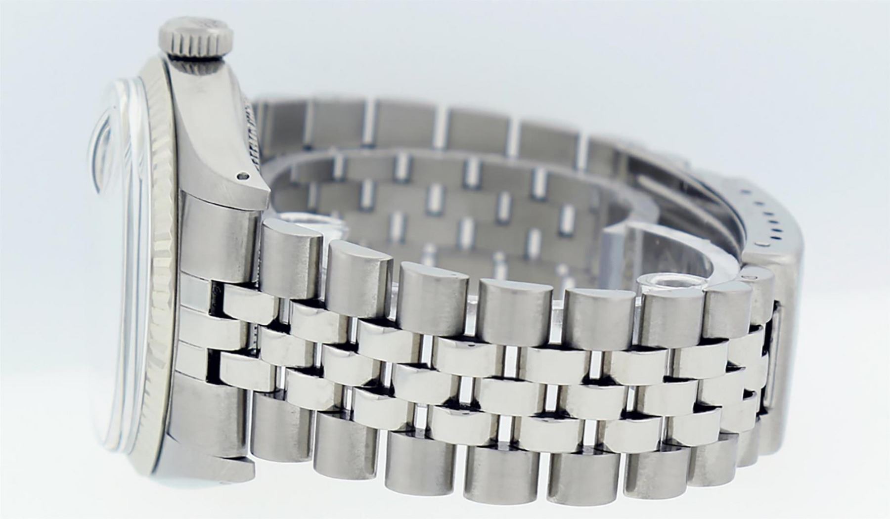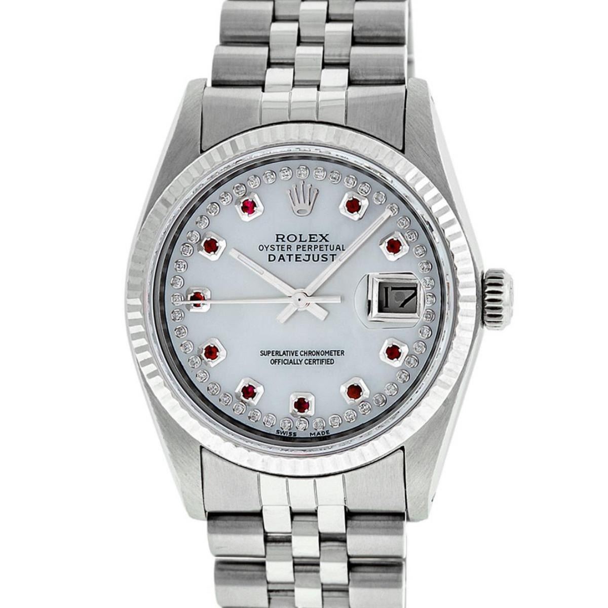 One Mens Stainless Steel Rolex Datejust Polished Bright with Satin Finish, Serviced & Electronically Tested, Stainless Steel Case: 36mm, Stainless Steel Crown, Original Bezel: 14K White Gold Fluted Bezel. Custom Crystal: New Acrylic Cyclops Lens. Custom Hands: New Luminescent Hands. Movement: Automatic Winding Movement. Custom Dial: Mother Of Pearl Ruby String Diamond Dial, Stone Count: 10 Rubies + 48 Diamonds in Dial, G To H In Color, SI-VS Clarity. Date Window: 3 O'Clock Position Date Display, Quickset, Model: Datejust, Condition: G-6 Extra Fine. Bracelet: Stainless Steel Jubilee. Bright Polish & Satin Finish. 7.0 Inch Length, Adjustable. Standard Clasp, With Rolex Logo. Watch Has Been Serviced And Polished It Is Free Of All Scratches And Dents.