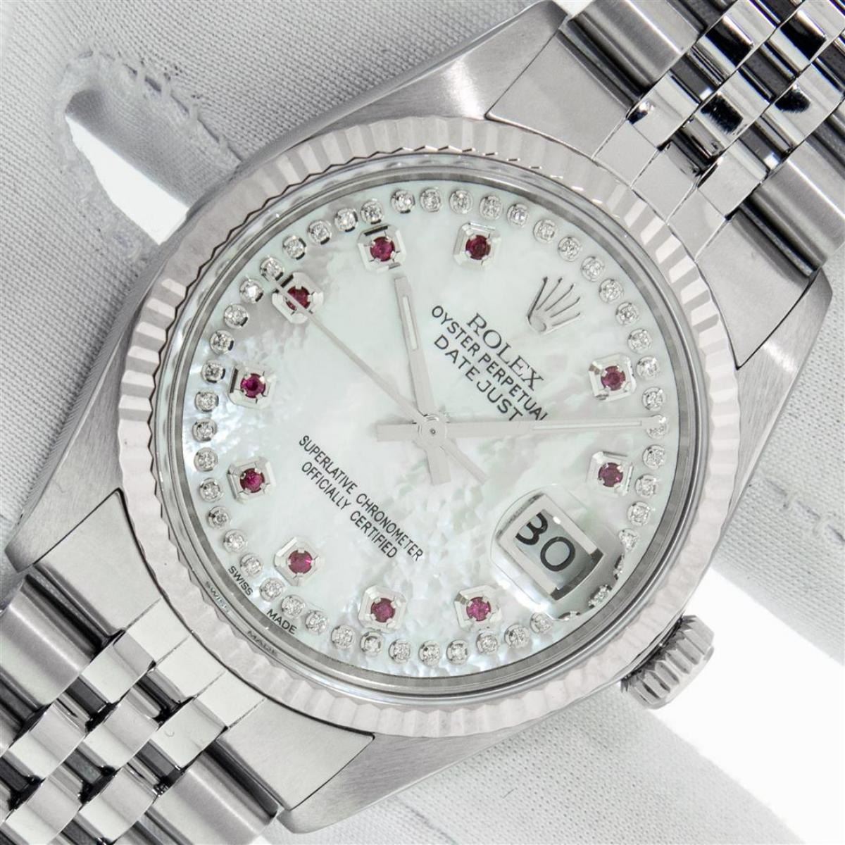 One Mens Pre Owned Stainless Steel Rolex Datejust Polished Bright with Satin Finish, Serviced & Electronically Tested, Rolex Stainless Steel Case: 36mm, Rolex Stainless Steel Crown, Original Bezel: 14K White Gold Fluted Bezel. Custom Crystal: New Acrylic Cyclops Lens. Custom Hands: New Luminescent Hands. Rolex Movement: Automatic Winding Movement. Custom Dial: Refinished To Mother Of Pearl Ruby With added Diamonds, Stone Count: 10 Synthetic Rubies + 48 Diamonds in Dial, G To H In Color, SI-VS Clarity. Date Window: 3 O'Clock Position Date Display, Quickset, Model: Datejust, Condition: G-6 Extra Fine. Rolex Bracelet: Stainless Steel Jubilee. Bright Polish & Satin Finish. 7.0 Inch Length, Adjustable. Standard Clasp, With Rolex Logo. Watch Has Been Serviced And Polished It Is Free Of All Scratches And Dents.