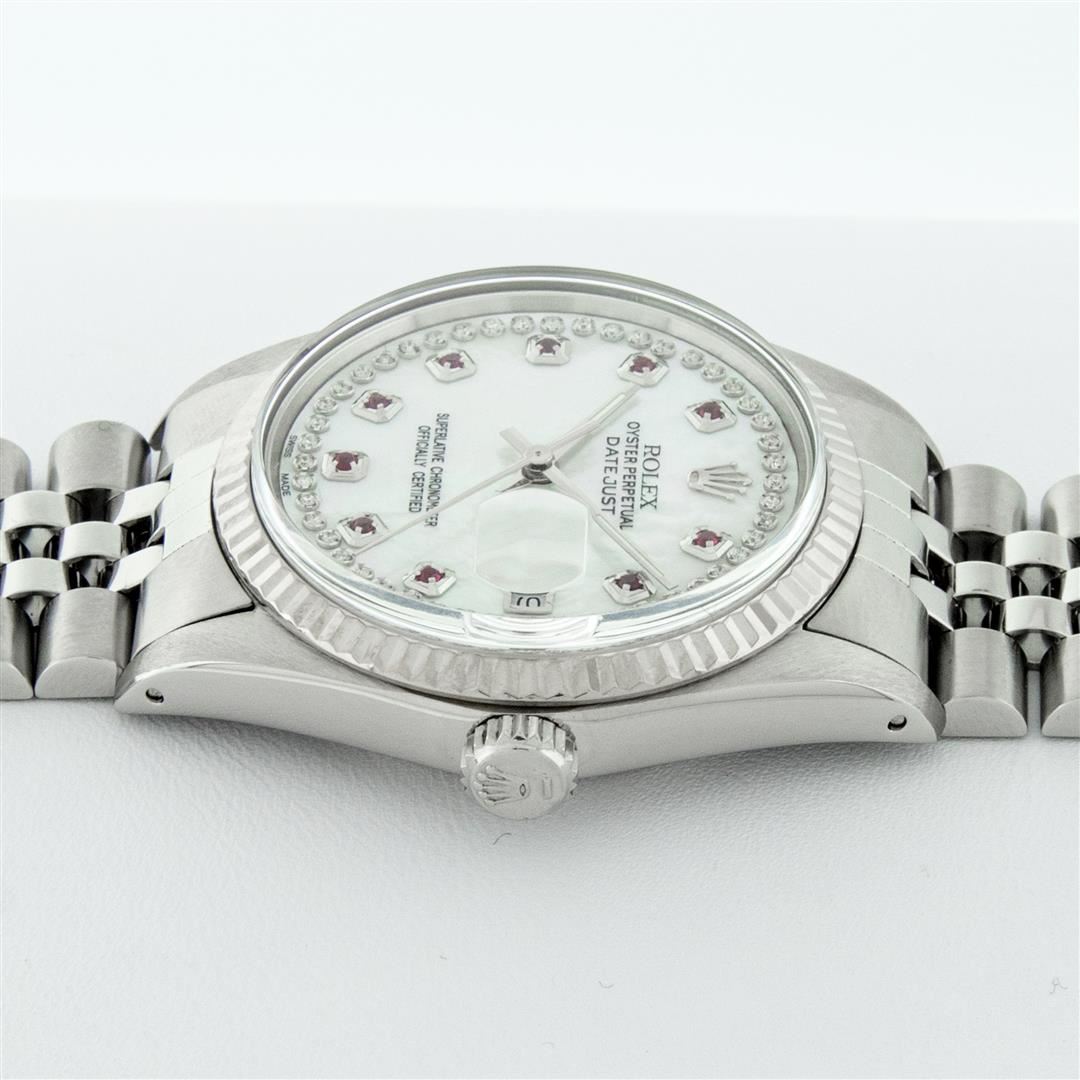 One Mens Stainless Steel Rolex Datejust Polished Bright with Satin Finish, Serviced & Electronically Tested, Stainless Steel Case: 36mm, Stainless Steel Crown, Original Bezel: 14K White Gold Fluted Bezel. Custom Crystal: New Acrylic Cyclops Lens. Custom Hands: New Luminescent Hands. Movement: Automatic Winding Movement. Custom Dial: Mother Of Pearl Ruby String Diamond Dial, Stone Count: 10 Rubies + 48 Diamonds in Dial, G To H In Color, SI-VS Clarity. Date Window: 3 O'Clock Position Date Display, Quickset, Model: Datejust, Condition: G-6 Extra Fine. Bracelet: Stainless Steel Jubilee. Bright Polish & Satin Finish. 7.0 Inch Length, Adjustable. Standard Clasp, With Rolex Logo. Watch Has Been Serviced And Polished It Is Free Of All Scratches And Dents.
