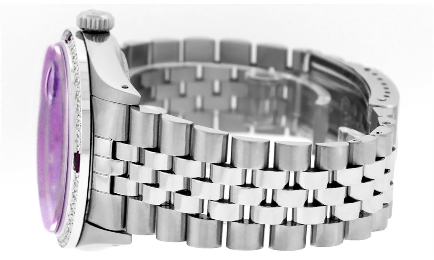 One Mens Stainless Steel Rolex Datejust Polished, Serviced & Electronically Tested, Stainless Steel Case: 36mm, Stainless Steel Crown, Custom Bezel: New 18K White Gold Ruby Beadset Diamond Bezel, Diamond + Gem Count: 36 Diamonds + 4 Rubies, Total Weight 1.00 Carat, Clarity: SI-VS, Color: G to H. Custom Crystal: New Scratch Resistant Synthetic Sapphire Cyclops Lens. Custom Hands: New Luminescent Hands. Movement: Automatic Winding Movement Caliber 3035. Custom Refinished Dial: Pink With Diamond Hour Markers, Diamond Count: 10 Diamonds In Dial, G To H In Color, Clarity: SI-VS. Date Window: 3 O'Clock Position Date Display, Quickset, Model: Datejust. Condition: G-6 Extra Fine. Bracelet: Stainless Steel Jubilee Band. Bright Polish & Satin Finish. 7.0 Inch Length, Adjustable. Standard Clasp, With Rolex Logo. This Watch Has Been Serviced Time Tested And Is In Excellent Condition It Is Free Of All Scratches And Dents.