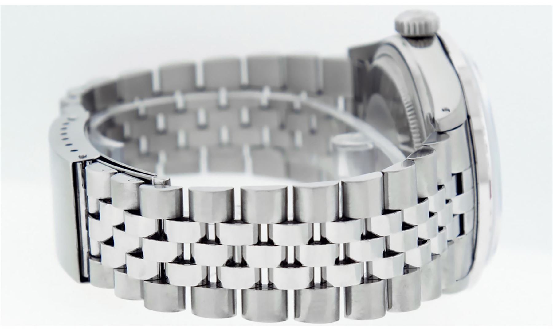 One Mens Stainless Steel Rolex Datejust Polished, Serviced & Electronically Tested, Stainless Steel Case: 36mm, Stainless Steel Crown, Custom Bezel: New 18K White Gold Ruby Beadset Diamond Bezel, Diamond + Gem Count: 36 Diamonds + 4 Rubies, Total Weight 1.00 Carat, Clarity: SI-VS, Color: G to H. Custom Crystal: New Scratch Resistant Synthetic Sapphire Cyclops Lens. Custom Hands: New Luminescent Hands. Movement: Automatic Winding Movement Caliber 3035. Custom Refinished Dial: Pink With Diamond Hour Markers, Diamond Count: 10 Diamonds In Dial, G To H In Color, Clarity: SI-VS. Date Window: 3 O'Clock Position Date Display, Quickset, Model: Datejust. Condition: G-6 Extra Fine. Bracelet: Stainless Steel Jubilee Band. Bright Polish & Satin Finish. 7.0 Inch Length, Adjustable. Standard Clasp, With Rolex Logo. This Watch Has Been Serviced Time Tested And Is In Excellent Condition It Is Free Of All Scratches And Dents.