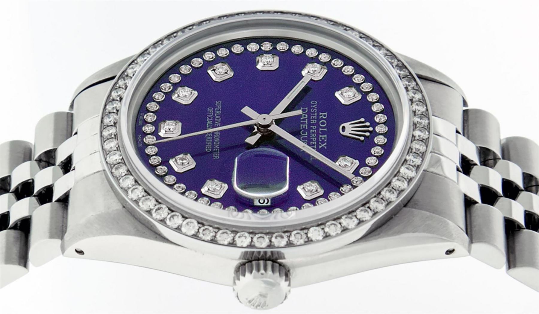 One Mens Rolex Stainless Steel Datejust Polished Bright with Satin Finish, This Watch Has Been Serviced & Electronically Tested, Stainless Steel Case: 36mm, Stainless Steel Crown, Custom Bezel: New Stainless Steel Beadset Diamond Bezel, Diamond Count: 54 Diamonds, Total Weight 1.00 Carat, Clarity: SI-VS, Color: G to H. Custom Crystal: New Synthetic Sapphire Cyclops Lens. Custom Hands: New Luminescent Hands. Movement: Automatic Winding Movement Caliber 3035. Custom Dial: Purple String Diamond Dial, Diamond Count: 58 Diamonds In Dial, Color: G to H, Clarity: VS2-SI1. Date Window: 3 O'Clock Position Date Display, Quickset, Model: Datejust. Condition: G-6 Extra Fine. Bracelet: Stainless Steel Jubilee Band. Bright Polish & Satin Finish. 7.0 Inch Length, Adjustable. Standard Clasp, With Rolex Logo. This Watch Has Been Serviced Time Tested And Is In Excellent Condition It Is Free Of All Scratches And Dents.