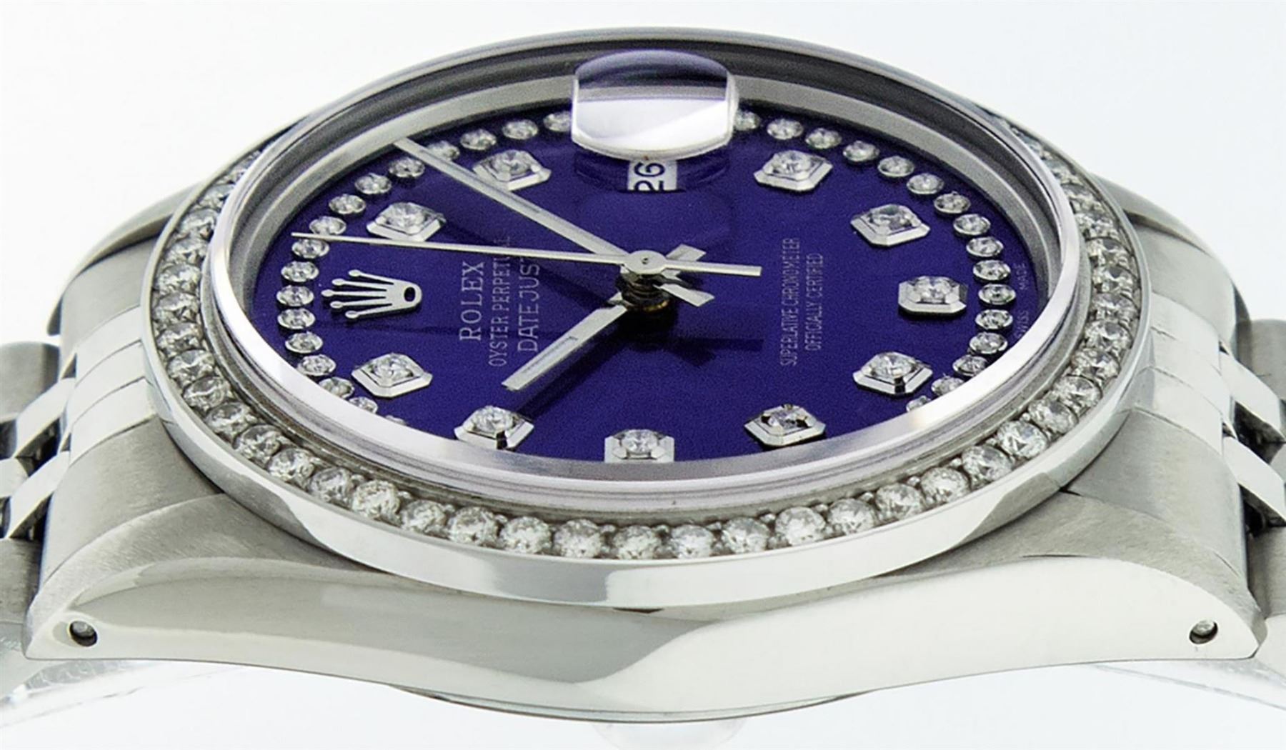 One Mens Rolex Stainless Steel Datejust Polished Bright with Satin Finish, This Watch Has Been Serviced & Electronically Tested, Stainless Steel Case: 36mm, Stainless Steel Crown, Custom Bezel: New Stainless Steel Beadset Diamond Bezel, Diamond Count: 54 Diamonds, Total Weight 1.00 Carat, Clarity: SI-VS, Color: G to H. Custom Crystal: New Synthetic Sapphire Cyclops Lens. Custom Hands: New Luminescent Hands. Movement: Automatic Winding Movement Caliber 3035. Custom Dial: Purple String Diamond Dial, Diamond Count: 58 Diamonds In Dial, Color: G to H, Clarity: VS2-SI1. Date Window: 3 O'Clock Position Date Display, Quickset, Model: Datejust. Condition: G-6 Extra Fine. Bracelet: Stainless Steel Jubilee Band. Bright Polish & Satin Finish. 7.0 Inch Length, Adjustable. Standard Clasp, With Rolex Logo. This Watch Has Been Serviced Time Tested And Is In Excellent Condition It Is Free Of All Scratches And Dents.