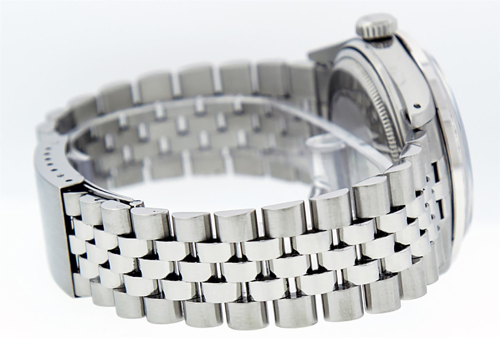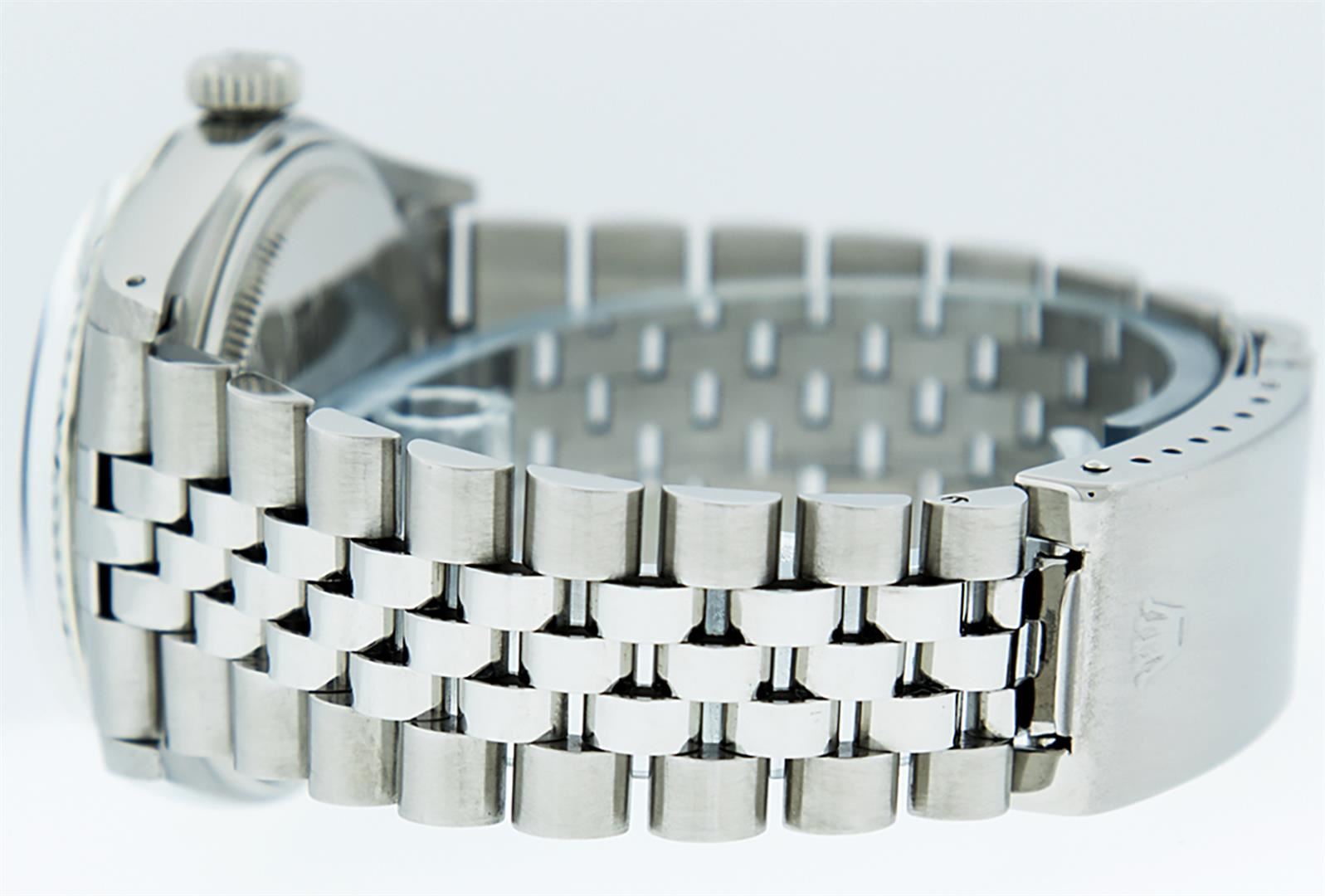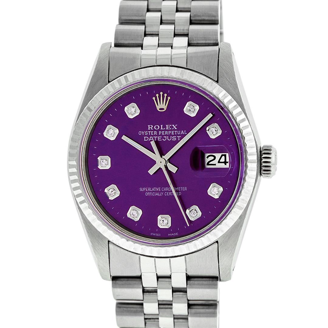 One Mens Stainless Steel Rolex Datejust Polished Bright with Satin Finish, This Watch Has Been Serviced & Electronically Tested, Stainless Steel Case: 36mm, Stainless Steel Crown, Bezel: 14K White Gold Fluted Bezel. Custom Crystal: New Acrylic Cyclops Lens. Custom Hands: New Luminescent Hands. Movement: Automatic Winding Movement Caliber 3035. Custom Dial: Purple Diamond Dial With Diamond Hour Markers And Dash Track, Diamond Count: 10 Diamonds in Dial G To H In Color, SI-VS Clarity. Date Window: 3 O'Clock Position Date Display, Quickset, Model: Datejust, Condition: G-6 Extra Fine. Bracelet: Stainless Steel Jubilee Band. Bright Polish & Satin Finish. 7.0 Inch Length, Adjustable. Standard Clasp, With Rolex Logo. This Watch Has Been Serviced Time Tested And Is In Excellent Condition It Is Free Of All Scratches And Dents