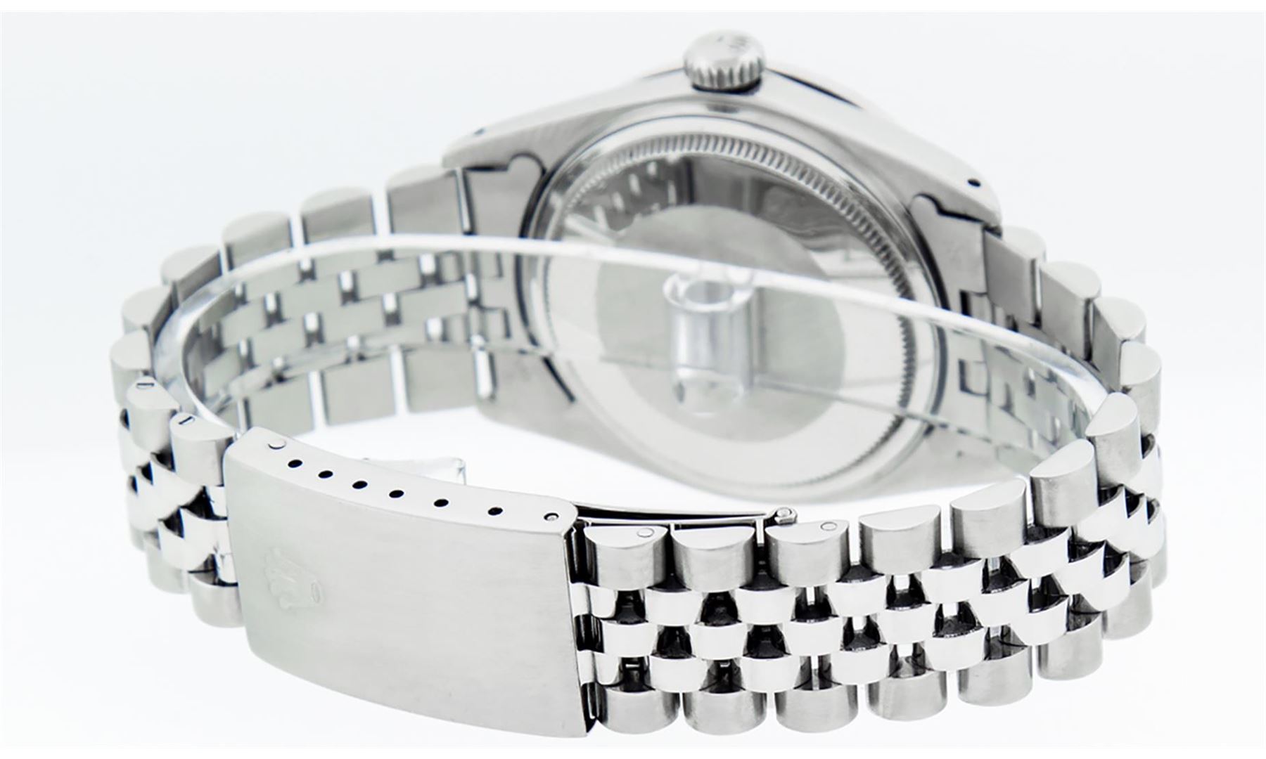 One Mens Stainless Steel Rolex Datejust Polished Bright with Satin Finish, This Watch Has Been Serviced & Electronically Tested, Stainless Steel Case: 36mm, Stainless Steel Crown, Custom Bezel: New 18K White Gold Ruby Beadset Diamond Bezel, Diamond + Gem Count: 36 Diamonds + 4 Rubies, Total Weight 1.00 Carat, Clarity: SI-VS, Color: G to H. Custom Crystal: New Scratch Resistant Synthetic Sapphire Cyclops Lens. Custom Hands: New Luminescent Hands. Movement: Automatic Winding Movement Caliber 3035. Custom Dial: Purple With Roman Track & Square Track. Date Window: 3 O'Clock Position Date Display, Quickset, Model: Datejust, Condition: G-6 Extra Fine. Bracelet: Stainless Steel Jubilee Band. Bracelet: 7.0 Inch Length, Adjustable. Standard Clasp, With Rolex Logo. This Watch Has Been Serviced Time Tested And Is In Excellent Condition It Is Free Of All Scratches And Dents.