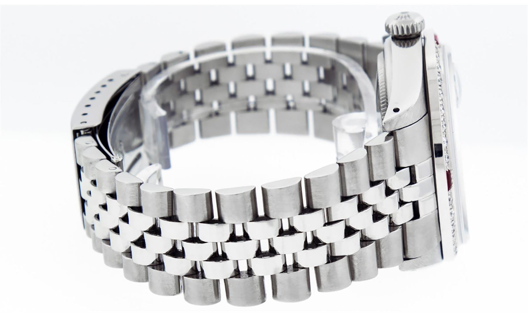 One Mens Stainless Steel Rolex Datejust Polished Bright with Satin Finish, This Watch Has Been Serviced & Electronically Tested, Stainless Steel Case: 36mm, Stainless Steel Crown, Custom Bezel: New 18K White Gold Ruby Beadset Diamond Bezel, Diamond + Gem Count: 36 Diamonds + 4 Rubies, Total Weight 1.00 Carat, Clarity: SI-VS, Color: G to H. Custom Crystal: New Scratch Resistant Synthetic Sapphire Cyclops Lens. Custom Hands: New Luminescent Hands. Movement: Automatic Winding Movement Caliber 3035. Custom Dial: Purple With Roman Track & Square Track. Date Window: 3 O'Clock Position Date Display, Quickset, Model: Datejust, Condition: G-6 Extra Fine. Bracelet: Stainless Steel Jubilee Band. Bracelet: 7.0 Inch Length, Adjustable. Standard Clasp, With Rolex Logo. This Watch Has Been Serviced Time Tested And Is In Excellent Condition It Is Free Of All Scratches And Dents.