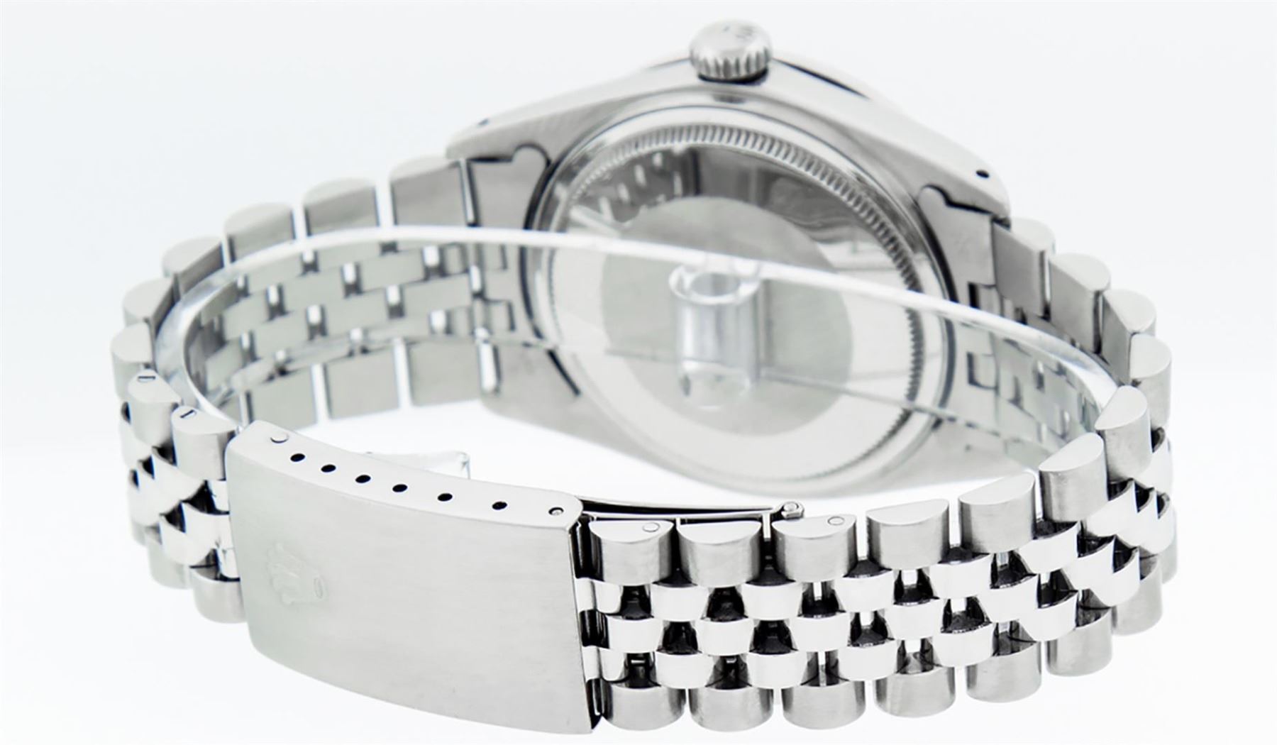 One Mens Pre Owned Stainless Steel Rolex Datejust Polished Bright with Satin Finish, This Watch Has Been Serviced & Electronically Tested, Rolex Stainless Steel Case: 36mm, Rolex Stainless Steel Crown, Custom Bezel: New 18K White Gold Ruby Bead set Diamon
