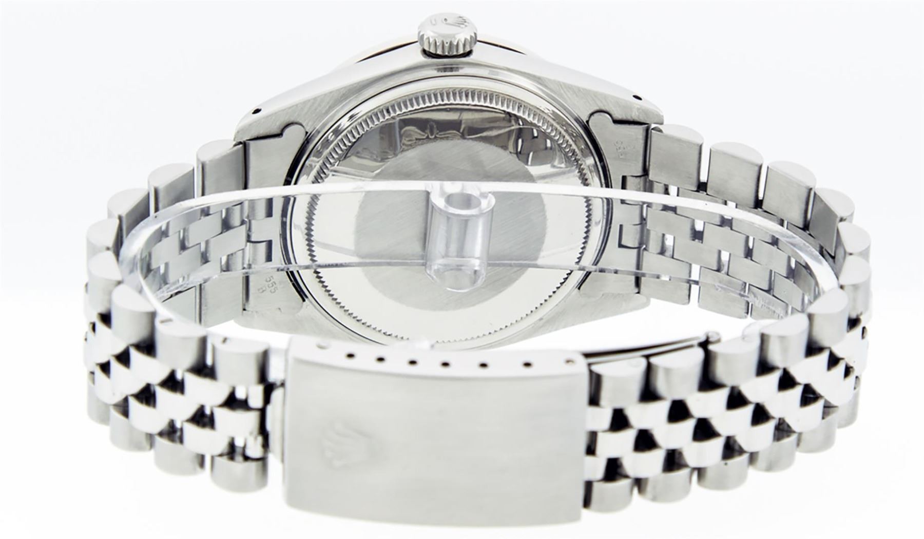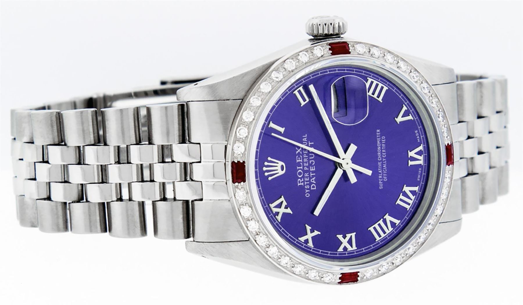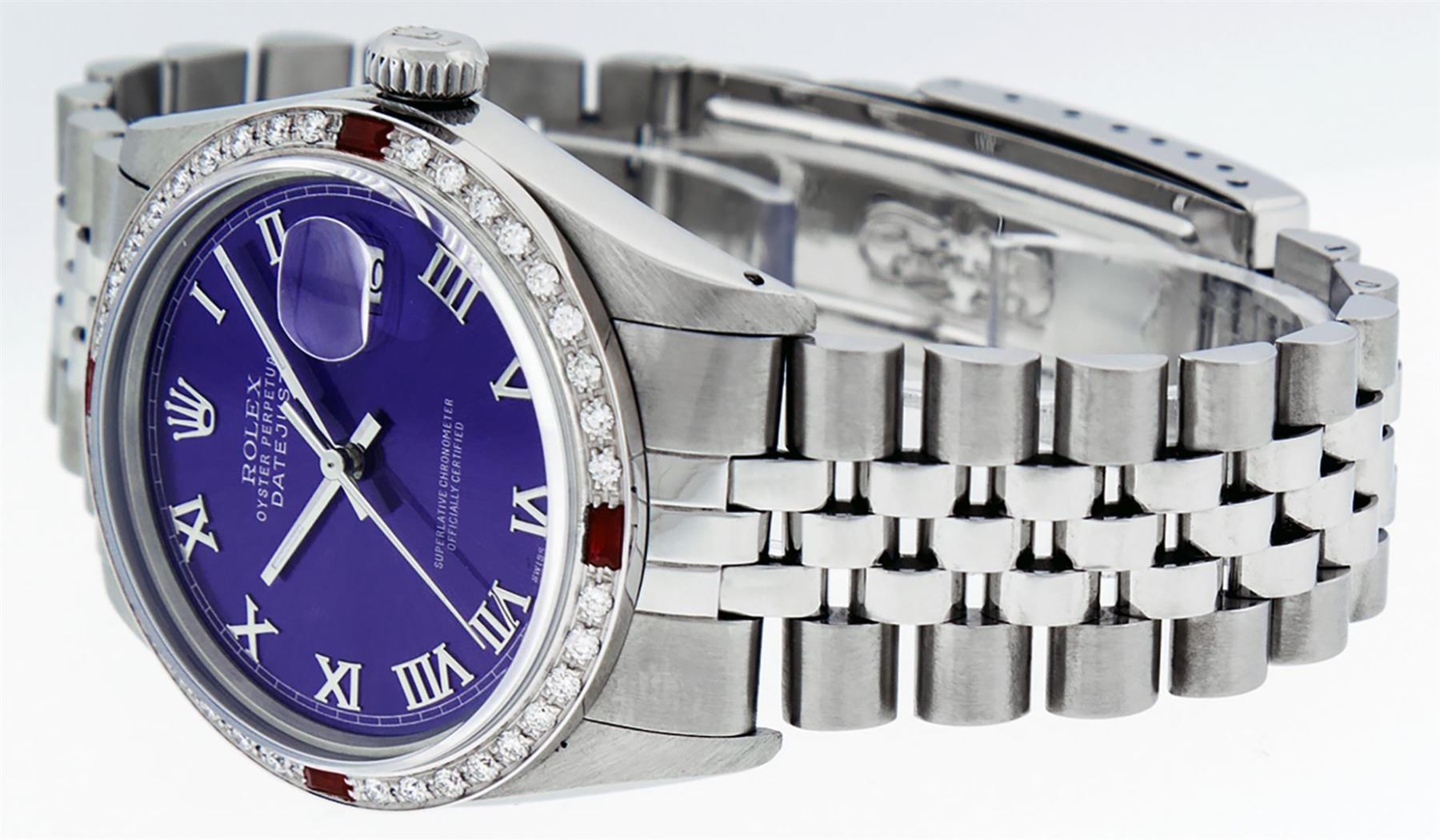 One Mens Pre Owned Stainless Steel Rolex Datejust Polished Bright with Satin Finish, This Watch Has Been Serviced & Electronically Tested, Rolex Stainless Steel Case: 36mm, Rolex Stainless Steel Crown, Custom Bezel: New 18K White Gold Ruby Bead set Diamond Bezel, Diamond + Gem Count: 36 Diamonds + 4 Rubies, Clarity: SI-VS, Color: G to H. Custom Crystal: New Sapphire With Magnified Date. Custom Hands: New Luminescent Hands. Rolex Movement: Automatic Winding Movement. Custom Dial: Refinished to Purple With Roman Track & Square Track. Date Window: 3 O'clock Position Date Display, Quickset, Model: Datejust, Condition: G-6 Extra Fine. Rolex Bracelet: Stainless Steel Jubilee Band. Bracelet: 7.0 Inch Length, Adjustable. Standard Clasp, With Rolex Logo. This Watch Has Been Serviced Time Tested And Is In Excellent Condition It Is Free Of All Scratches And Dents.