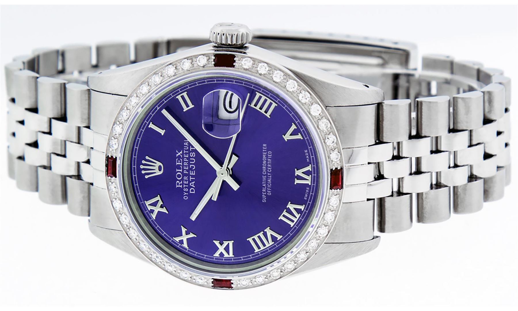 One Mens Pre Owned Stainless Steel Rolex Datejust Polished Bright with Satin Finish, This Watch Has Been Serviced & Electronically Tested, Rolex Stainless Steel Case: 36mm, Rolex Stainless Steel Crown, Custom Bezel: New 18K White Gold Ruby Bead set Diamond Bezel, Diamond + Gem Count: 36 Diamonds + 4 Rubies, Clarity: SI-VS, Color: G to H. Custom Crystal: New Sapphire With Magnified Date. Custom Hands: New Luminescent Hands. Rolex Movement: Automatic Winding Movement. Custom Dial: Refinished to Purple With Roman Track & Square Track. Date Window: 3 O'clock Position Date Display, Quickset, Model: Datejust, Condition: G-6 Extra Fine. Rolex Bracelet: Stainless Steel Jubilee Band. Bracelet: 7.0 Inch Length, Adjustable. Standard Clasp, With Rolex Logo. This Watch Has Been Serviced Time Tested And Is In Excellent Condition It Is Free Of All Scratches And Dents.
