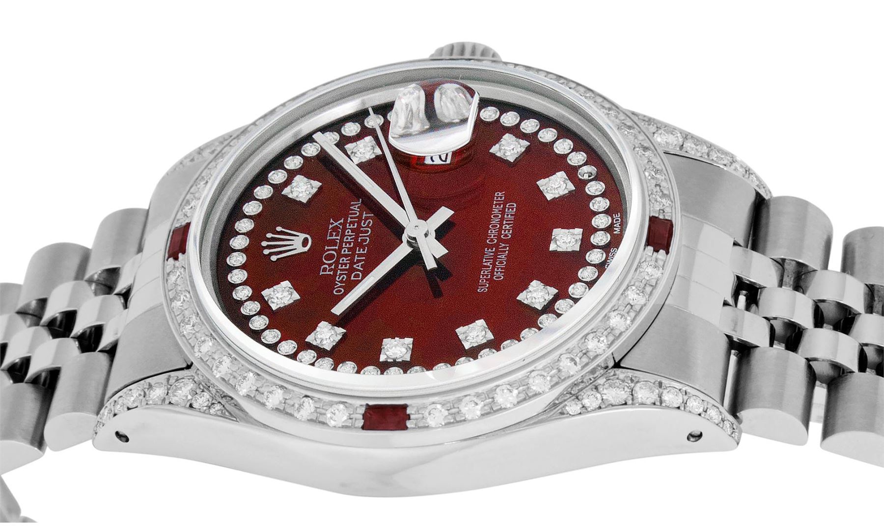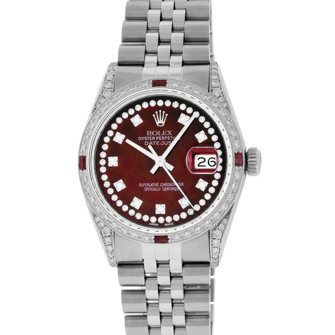 One Mens Pre Owned Stainless Steel Rolex Datejust Polished Bright with Satin Finish, Serviced And Electronically Tested, Rolex Stainless Steel Case: 36mm, Custom Diamond Lugs: 28 Added Diamonds On Lugs. Rolex Stainless Steel Crown, Custom Bezel: New 18K White Gold Diamond + Ruby Beadset, Diamond Count: 36 Diamonds + 4 Rubies. Custom Crystal: New Sapphire With Date Window. Custom Hands: New Luminescent Hands. Rolex Movement: Automatic Winding Movement 3035. Custom Dial: Custom Red Dial With Custom Added Diamonds, Stone Count: 43 Diamonds On Dial. Date Window: 3 O'Clock Position Date Display, Quickset, Model: Datejust. Condition: G-6 Extra Fine. Rolex Bracelet: Stainless Steel Jubilee Band. Bright Polish And Satin Finish. 7.0 Inch Length, Adjustable. Standard Clasp, With Rolex Logo. This Watch Has Been Serviced And Polished And Its Free Of All Dents And Scratches.