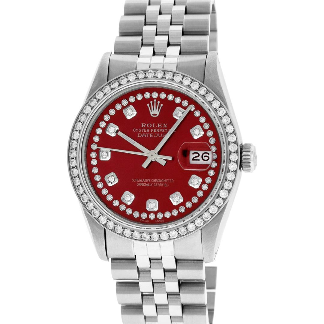 One Mens Rolex Stainless Steel Datejust Polished Bright with Satin Finish, This Watch Has Been Serviced & Electronically Tested, Stainless Steel Case: 36mm, Stainless Steel Crown, Custom Bezel: New Stainless Steel Beadset Diamond Bezel, Diamond Count: 54 Diamonds In Bezel, Total Weight 1.00 Carat, Clarity: SI-VS, Color: G to H. Custom Crystal: New Synthetic Sapphire Cyclops Lens. Custom Hands: New Luminescent Hands. Movement: Automatic Winding Movement. Custom Dial: Red String Diamond Dial, Diamond Count: 58 Diamonds In Dial, Color: G to H, Clarity: VS2-SI1. Date Window: 3 O'Clock Position Date Display, Quickset, Model: Datejust. Condition: G-6 Extra Fine. Bracelet: Stainless Steel Jubilee Band. Bright Polish & Satin Finish. 7.0 Inch Length, Adjustable. Standard Clasp, With Rolex Logo. This Watch Has Been Serviced Time Tested And Is In Excellent Condition It Is Free Of All Scratches And Dents.