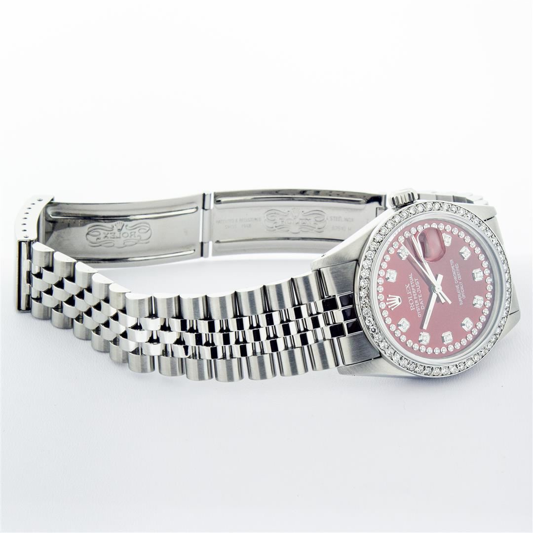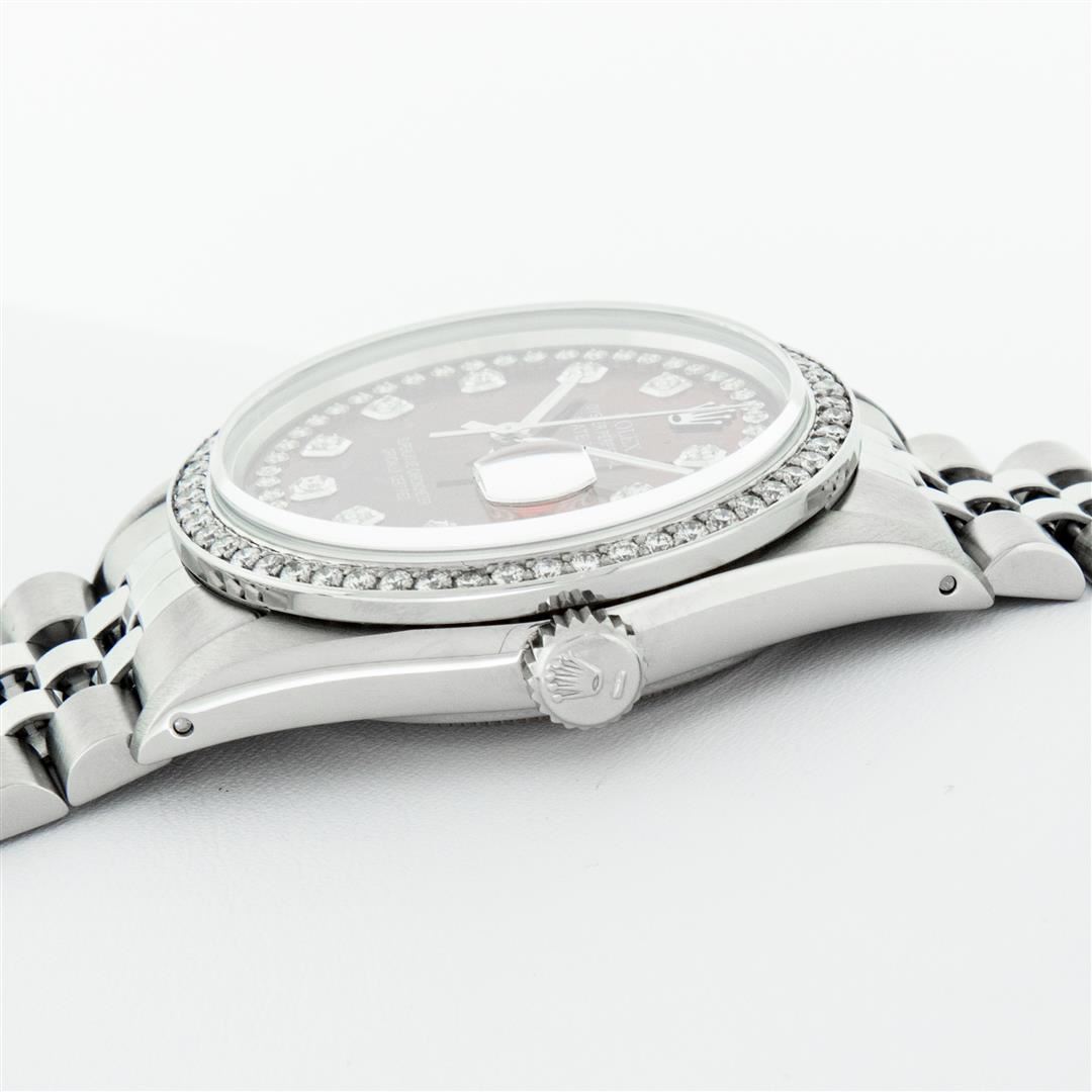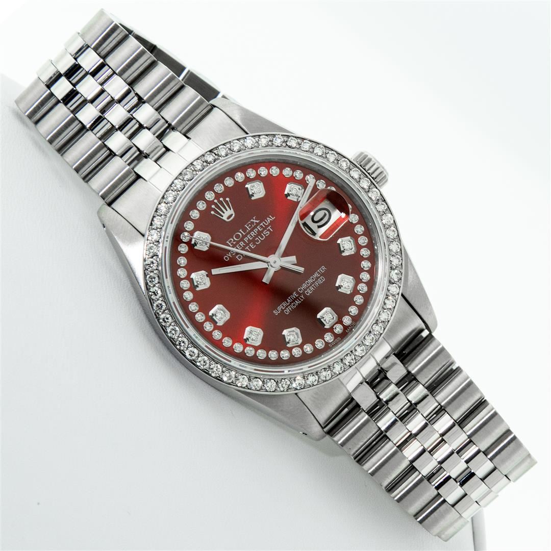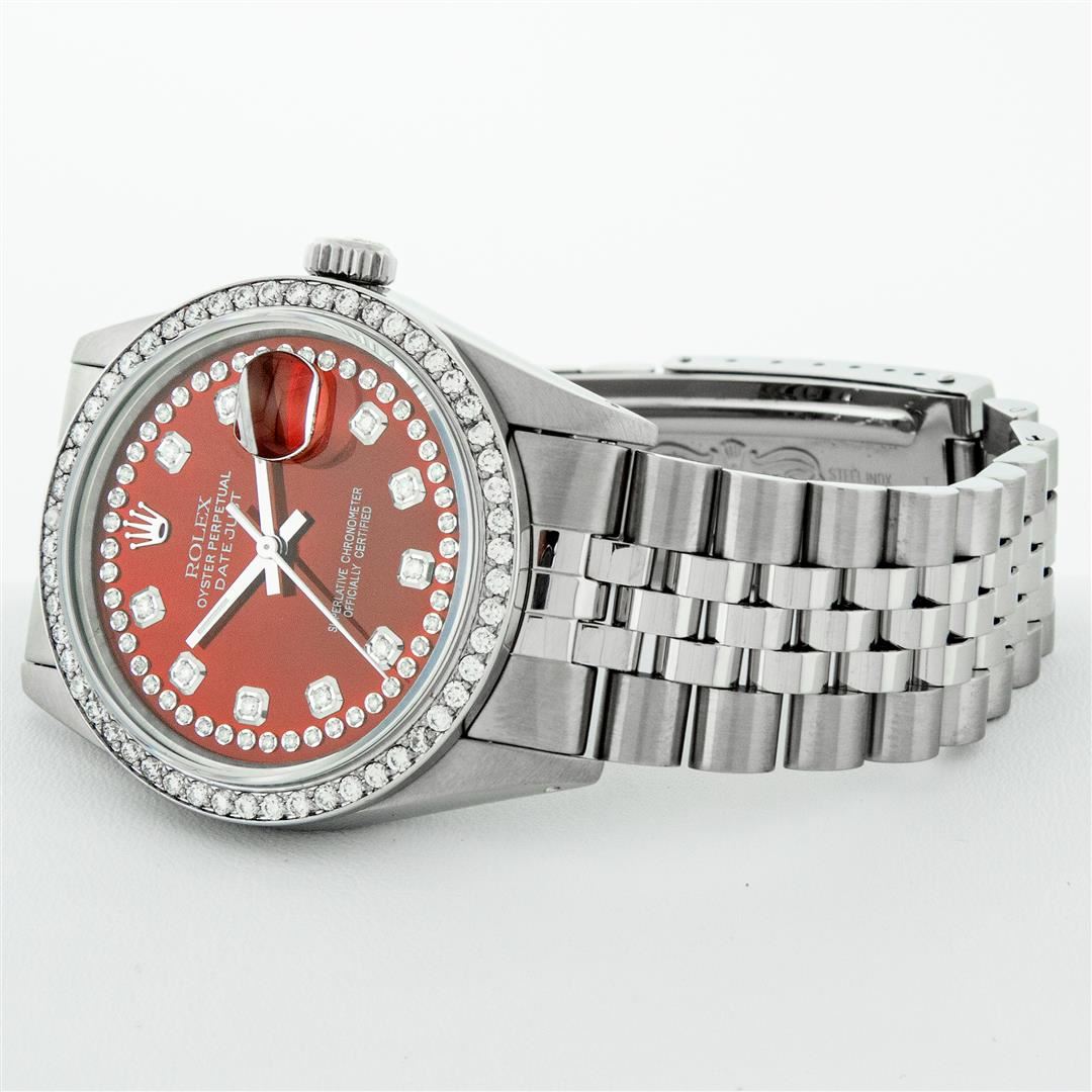 One Mens Rolex Stainless Steel Datejust Polished Bright with Satin Finish, This Watch Has Been Serviced & Electronically Tested, Stainless Steel Case: 36mm, Stainless Steel Crown, Custom Bezel: New Stainless Steel Beadset Diamond Bezel, Diamond Count: 54 Diamonds In Bezel, Total Weight 1.00 Carat, Clarity: SI-VS, Color: G to H. Custom Crystal: New Sapphire With Date Window. Custom Hands: New Luminescent Hands. Rolex Movement: Automatic Winding Movement. Custom Dial: Red String With Custom Added Diamonds, Diamond Count: 58 Diamonds In Dial, Color: G to H, Clarity: VS2-SI1. Date Window: 3 O'Clock Position Date Display, Quickset, Model: Datejust. Condition: G-6 Extra Fine. Rolex Bracelet: Stainless Steel Jubilee Band. Bright Polish & Satin Finish. 7.0 Inch Length, Adjustable. Standard Clasp, With Rolex Logo. This Pre Owned Watch Has Been Serviced Time Tested And Is In Excellent Condition It Is Free Of All Scratches And Dents.