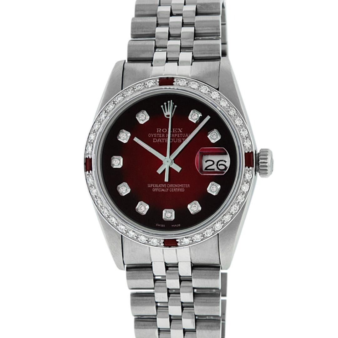 One Mens Pre Owned Stainless Steel Rolex Datejust Polished, Serviced And Electronically Tested, Stainless Steel Case: 36mm, Stainless Steel Crown, Custom Bezel: New 18K White Gold Ruby Beadset Diamond Bezel, Diamond + Gem Count: 36 Diamonds + 4 Rubies. Custom Crystal: New Sapphire With Magnified Date Window. Custom Hands: New Luminescent Hands. Rolex Movement: Automatic Winding Movement 3035. Custom Dial: Custom Red Vignette Dial With Added Diamond Hour Markers, 10 Diamond On Dial. Date Window: 3 O'Clock Position Date Display, Quickset, Model: Datejust. Condition: G-6 Extra Fine. Rolex Bracelet: Stainless Steel Jubilee Band. Bright Polish And Satin Finish. 7.0 Inch Length, Adjustable. Standard Clasp, With Rolex Logo. This Watch Has Been Serviced Time Tested And Is In Excellent Condition It Is Free Of All Scratches And Dents.
