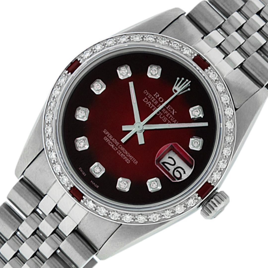 One Mens Pre Owned Stainless Steel Rolex Datejust Polished, Serviced And Electronically Tested, Stainless Steel Case: 36mm, Stainless Steel Crown, Custom Bezel: New 18K White Gold Ruby Beadset Diamond Bezel, Diamond + Gem Count: 36 Diamonds + 4 Rubies. Custom Crystal: New Sapphire With Magnified Date Window. Custom Hands: New Luminescent Hands. Rolex Movement: Automatic Winding Movement 3035. Custom Dial: Custom Red Vignette Dial With Added Diamond Hour Markers, 10 Diamond On Dial. Date Window: 3 O'Clock Position Date Display, Quickset, Model: Datejust. Condition: G-6 Extra Fine. Rolex Bracelet: Stainless Steel Jubilee Band. Bright Polish And Satin Finish. 7.0 Inch Length, Adjustable. Standard Clasp, With Rolex Logo. This Watch Has Been Serviced Time Tested And Is In Excellent Condition It Is Free Of All Scratches And Dents.