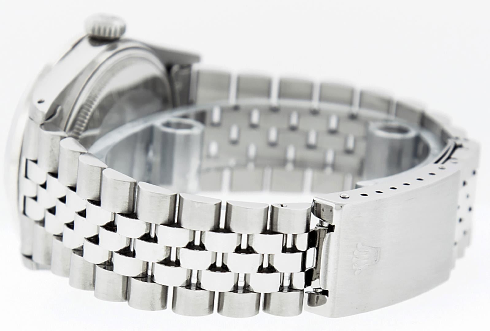 One Mens Pre Owned Stainless Steel Rolex Datejust Polished, Serviced And Electronically Tested, Rolex Stainless Steel Case: 36mm, Rolex Stainless Steel Crown, Custom Bezel: New 18K White Gold Ruby Beadset Diamond Bezel, Diamond + Gem Count: 36 Diamonds +