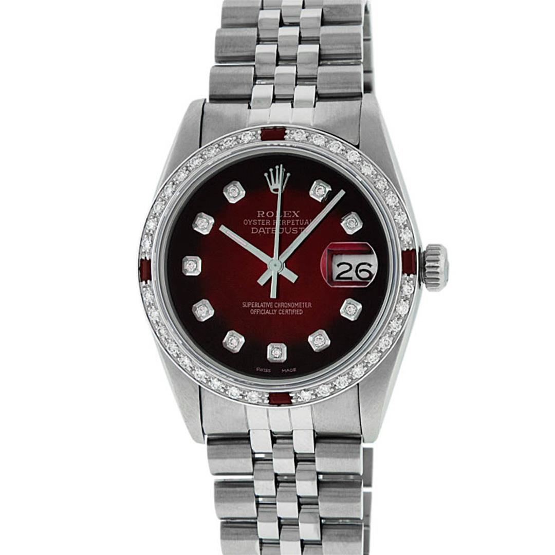 One Mens Stainless Steel Rolex Datejust Polished, Serviced & Electronically Tested, Stainless Steel Case: 36mm, Stainless Steel Crown, Custom Bezel: New 18K White Gold Ruby Beadset Diamond Bezel, Diamond + Gem Count: 36 Diamonds + 4 Rubies Total Weight 1.00 Carat, Clarity: SI-VS, Color: G to H. Custom Crystal: New Synthetic Sapphire Cyclops Lens. Custom Hands: New Luminescent Hands. Movement: Automatic Winding Movement Caliber 3035. Custom Dial: Red Vignette With Diamond Hour Markers, 10 Diamond Dial G To H In Color, Clarity: SI-VS. Date Window: 3 O'Clock Position Date Display, Quickset, Model: Datejust. Condition: G-6 Extra Fine. Bracelet: Stainless Steel Jubilee. Bright Polish & Satin Finish. 7.0 Inch Length, Adjustable. Standard Clasp, With Rolex Logo. This Watch Has Been Serviced Time Tested And Is In Excellent Condition It Is Free Of All Scratches And Dents