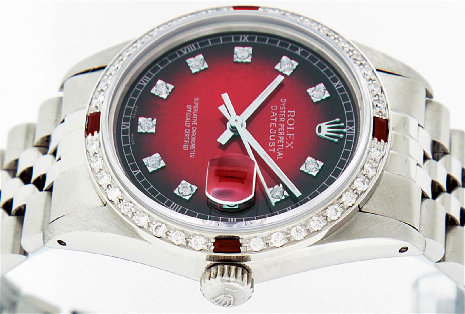 One Mens Stainless Steel Rolex Datejust Polished, Serviced & Electronically Tested, Stainless Steel Case: 36mm, Stainless Steel Crown, Custom Bezel: New 18K White Gold Ruby Beadset Diamond Bezel, Diamond + Gem Count: 36 Diamonds + 4 Rubies Total Weight 1.00 Carat, Clarity: SI-VS, Color: G to H. Custom Crystal: New Synthetic Sapphire Cyclops Lens. Custom Hands: New Luminescent Hands. Movement: Automatic Winding Movement Caliber 3035. Custom Dial: Red Vignette With Diamond Hour Markers, 10 Diamonds in Dial, G To H In Color, Clarity: SI-VS. Date Window: 3 O'Clock Position Date Display, Quickset, Model: Datejust. Condition: G-6 Extra Fine. Bracelet: Stainless Steel Jubilee. Bright Polish & Satin Finish. 7.0 Inch Length, Adjustable. Standard Clasp, With Rolex Logo. This Watch Has Been Serviced Time Tested And Is In Excellent Condition It Is Free Of All Scratches And Dents