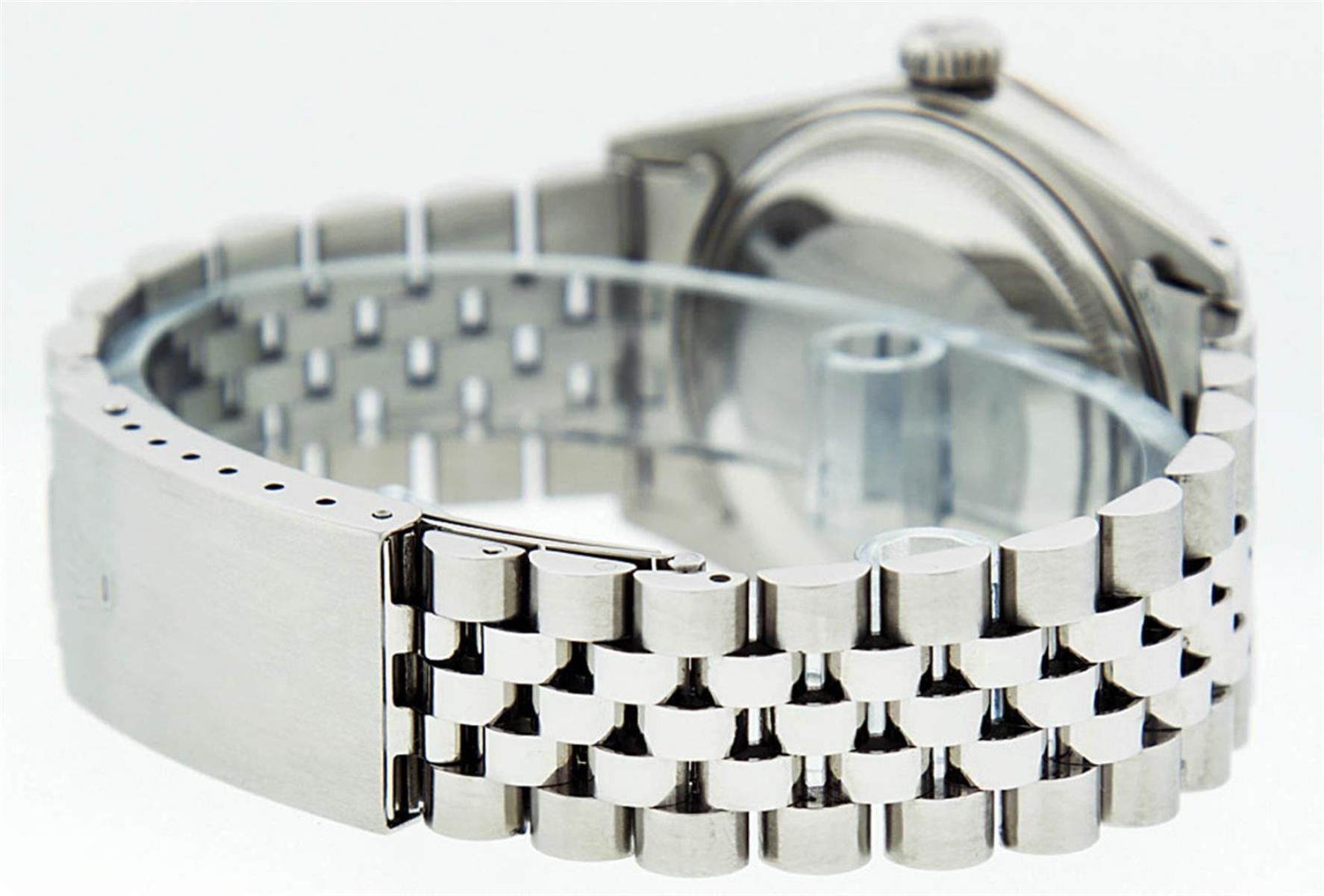 One Mens Stainless Steel Rolex Datejust Polished, Serviced & Electronically Tested, Stainless Steel Case: 36mm, Stainless Steel Crown, Custom Bezel: New 18K White Gold Ruby Beadset Diamond Bezel, Diamond + Gem Count: 36 Diamonds + 4 Rubies Total Weight 1.00 Carat, Clarity: SI-VS, Color: G to H. Custom Crystal: New Synthetic Sapphire Cyclops Lens. Custom Hands: New Luminescent Hands. Movement: Automatic Winding Movement Caliber 3035. Custom Dial: Red Vignette With Diamond Hour Markers, 10 Diamonds in Dial, G To H In Color, Clarity: SI-VS. Date Window: 3 O'Clock Position Date Display, Quickset, Model: Datejust. Condition: G-6 Extra Fine. Bracelet: Stainless Steel Jubilee. Bright Polish & Satin Finish. 7.0 Inch Length, Adjustable. Standard Clasp, With Rolex Logo. This Watch Has Been Serviced Time Tested And Is In Excellent Condition It Is Free Of All Scratches And Dents
