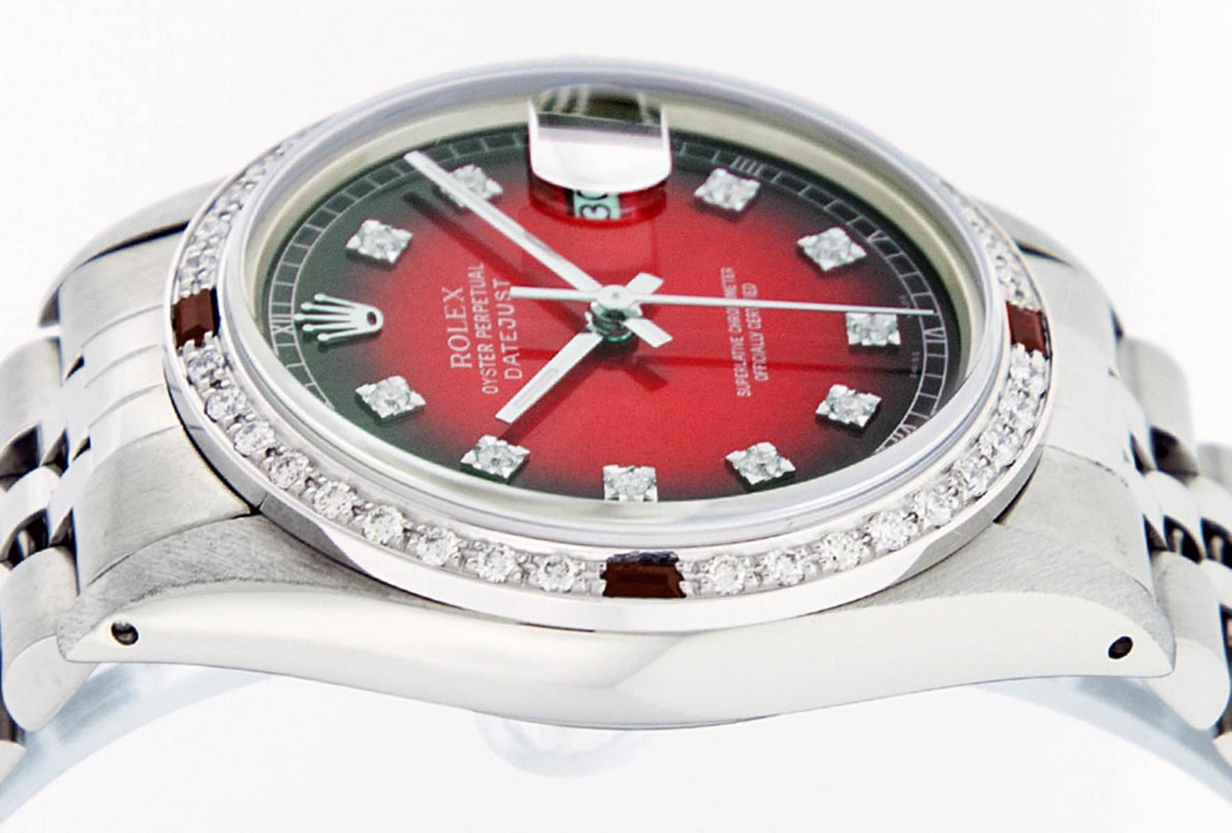 One Mens Stainless Steel Rolex Datejust Polished, Serviced & Electronically Tested, Stainless Steel Case: 36mm, Stainless Steel Crown, Custom Bezel: New 18K White Gold Ruby Beadset Diamond Bezel, Diamond + Gem Count: 36 Diamonds + 4 Rubies Total Weight 1.00 Carat, Clarity: SI-VS, Color: G to H. Custom Crystal: New Synthetic Sapphire Cyclops Lens. Custom Hands: New Luminescent Hands. Movement: Automatic Winding Movement Caliber 3035. Custom Dial: Red Vignette With Diamond Hour Markers, 10 Diamonds in Dial, G To H In Color, Clarity: SI-VS. Date Window: 3 O'Clock Position Date Display, Quickset, Model: Datejust. Condition: G-6 Extra Fine. Bracelet: Stainless Steel Jubilee. Bright Polish & Satin Finish. 7.0 Inch Length, Adjustable. Standard Clasp, With Rolex Logo. This Watch Has Been Serviced Time Tested And Is In Excellent Condition It Is Free Of All Scratches And Dents