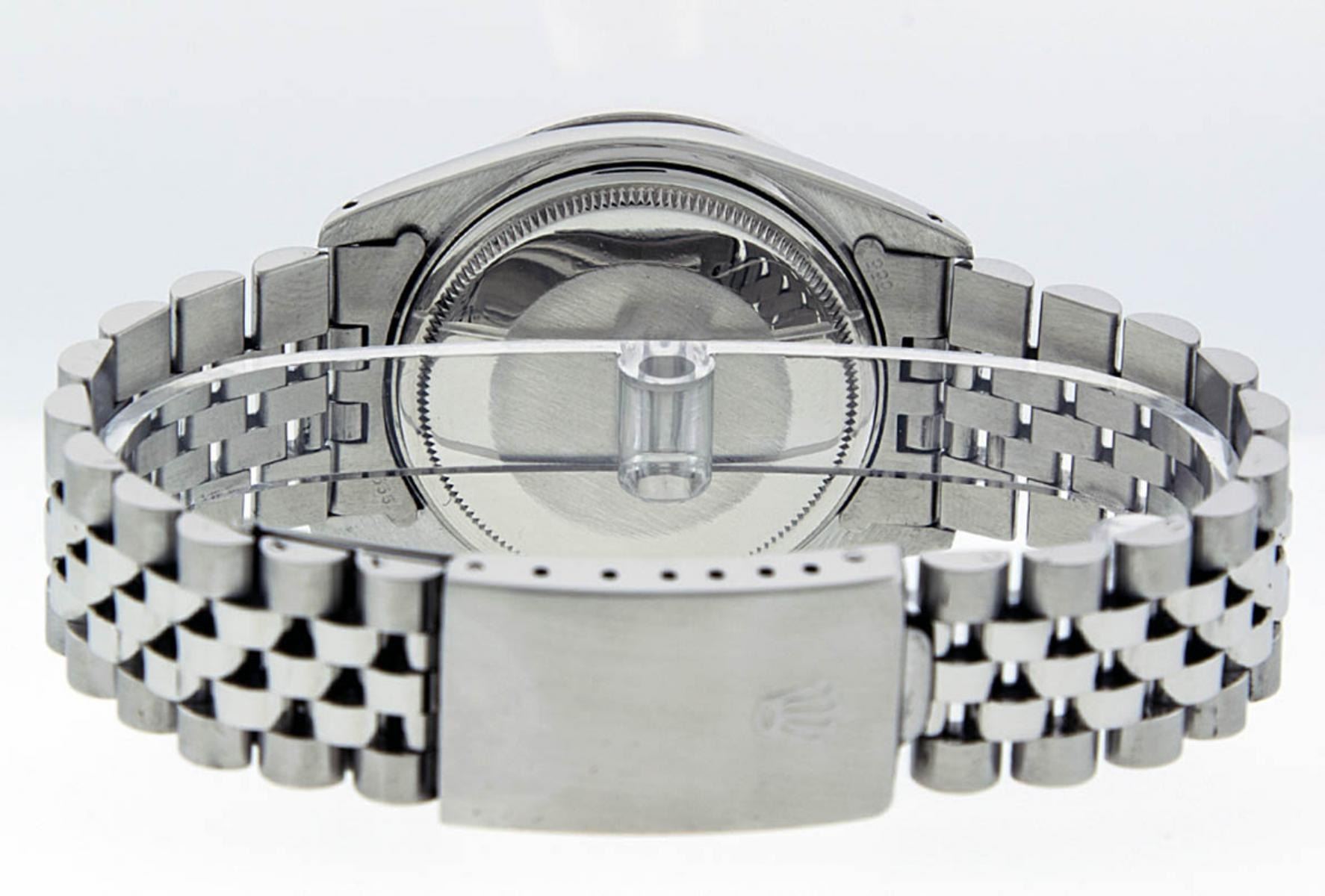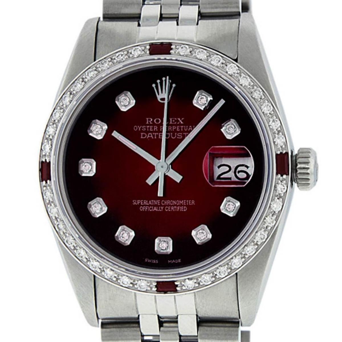 One Mens Stainless Steel Rolex Datejust Polished, Serviced & Electronically Tested, Stainless Steel Case: 36mm, Stainless Steel Crown, Custom Bezel: New 18K White Gold Ruby Beadset Diamond Bezel, Diamond + Gem Count: 36 Diamonds + 4 Rubies Total Weight 1.00 Carat, Clarity: SI-VS, Color: G to H. Custom Crystal: New Synthetic Sapphire Cyclops Lens. Custom Hands: New Luminescent Hands. Movement: Automatic Winding Movement Caliber 3035. Custom Dial: Red Vignette With Diamond Hour Markers, 10 Diamond Dial G To H In Color, Clarity: SI-VS. Date Window: 3 O'Clock Position Date Display, Quickset, Model: Datejust. Condition: G-6 Extra Fine. Bracelet: Stainless Steel Jubilee. Bright Polish & Satin Finish. 7.0 Inch Length, Adjustable. Standard Clasp, With Rolex Logo. This Watch Has Been Serviced Time Tested And Is In Excellent Condition It Is Free Of All Scratches And Dents