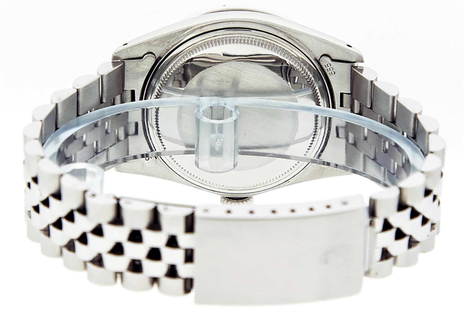 One Mens Stainless Steel Rolex Datejust Polished, Serviced & Electronically Tested, Stainless Steel Case: 36mm, Stainless Steel Crown, Custom Bezel: New 18K White Gold Ruby Beadset Diamond Bezel, Diamond + Gem Count: 36 Diamonds + 4 Rubies Total Weight 1.00 Carat, Clarity: SI-VS, Color: G to H. Custom Crystal: New Synthetic Sapphire Cyclops Lens. Custom Hands: New Luminescent Hands. Movement: Automatic Winding Movement. Custom Dial: Red Vignette With Diamond Hour Markers, 10 Diamonds in Dial, G To H In Color, Clarity: SI-VS. Date Window: 3 O'Clock Position Date Display, Quickset, Model: Datejust. Condition: G-6 Extra Fine. Bracelet: Stainless Steel Jubilee. Bright Polish & Satin Finish. 7.0 Inch Length, Adjustable. Standard Clasp, With Rolex Logo. This Watch Has Been Serviced Time Tested And Is In Excellent Condition It Is Free Of All Scratches And Dents