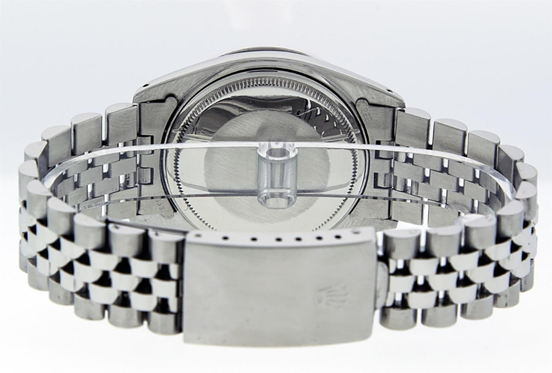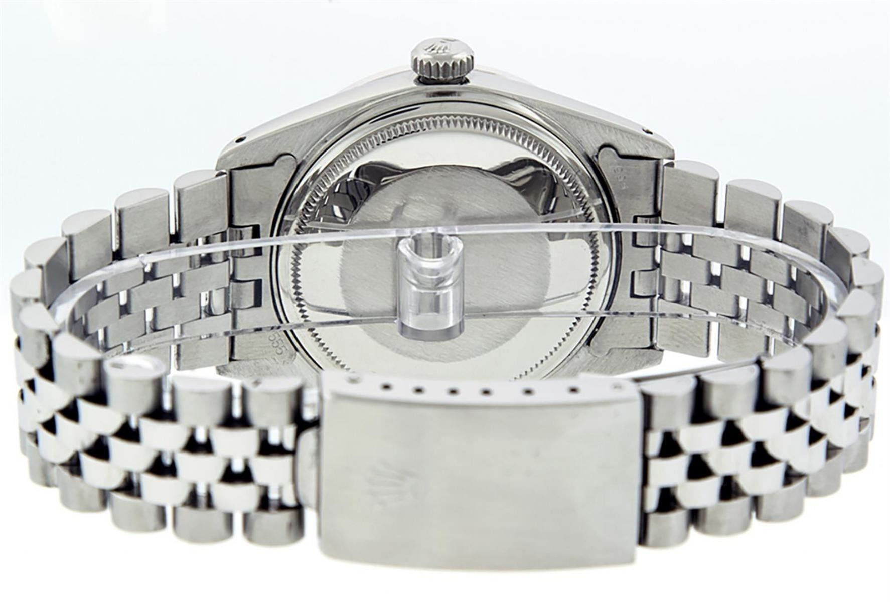 One Mens Stainless Steel Rolex Datejust Polished, Serviced & Electronically Tested, Stainless Steel Case: 36mm, Stainless Steel Crown, Custom Bezel: New 18K White Gold Ruby Beadset Diamond Bezel, Diamond + Gem Count: 36 Diamonds + 4 Rubies Total Weight 1.00 Carat, Clarity: SI-VS, Color: G to H. Custom Crystal: New Synthetic Sapphire Cyclops Lens. Custom Hands: New Luminescent Hands. Movement: Automatic Winding Movement. Custom Dial: Red Vignette With Diamond Hour Markers, 10 Diamond Dial G To H In Color, Clarity: SI-VS. Date Window: 3 O'Clock Position Date Display, Quickset, Model: Datejust. Condition: G-6 Extra Fine. Bracelet: Stainless Steel Jubilee. Bright Polish & Satin Finish. 7.0 Inch Length, Adjustable. Standard Clasp, With Rolex Logo. This Watch Has Been Serviced Time Tested And Is In Excellent Condition It Is Free Of All Scratches And Dents