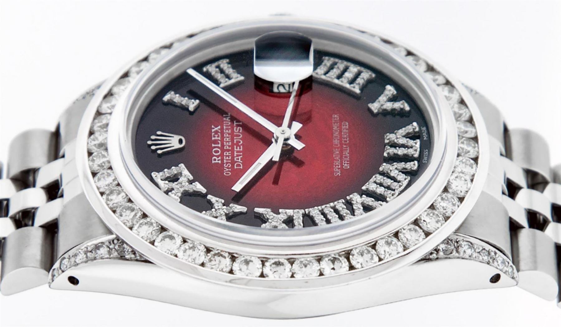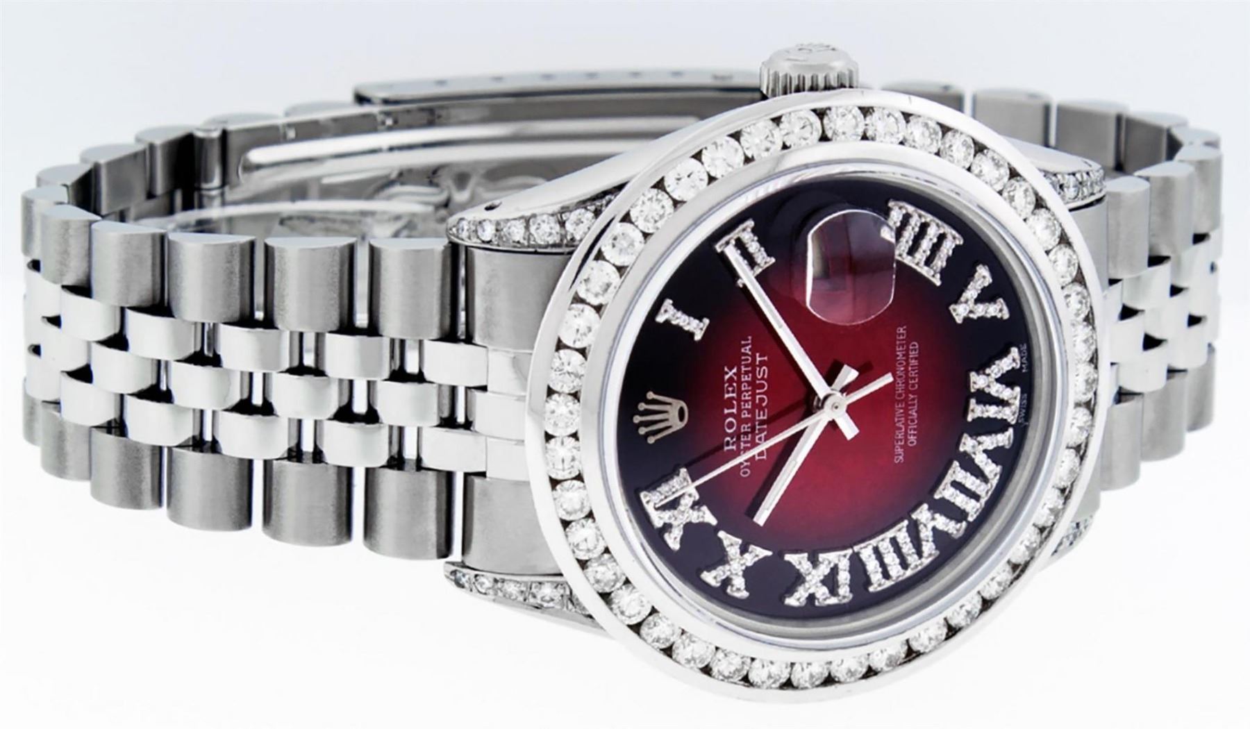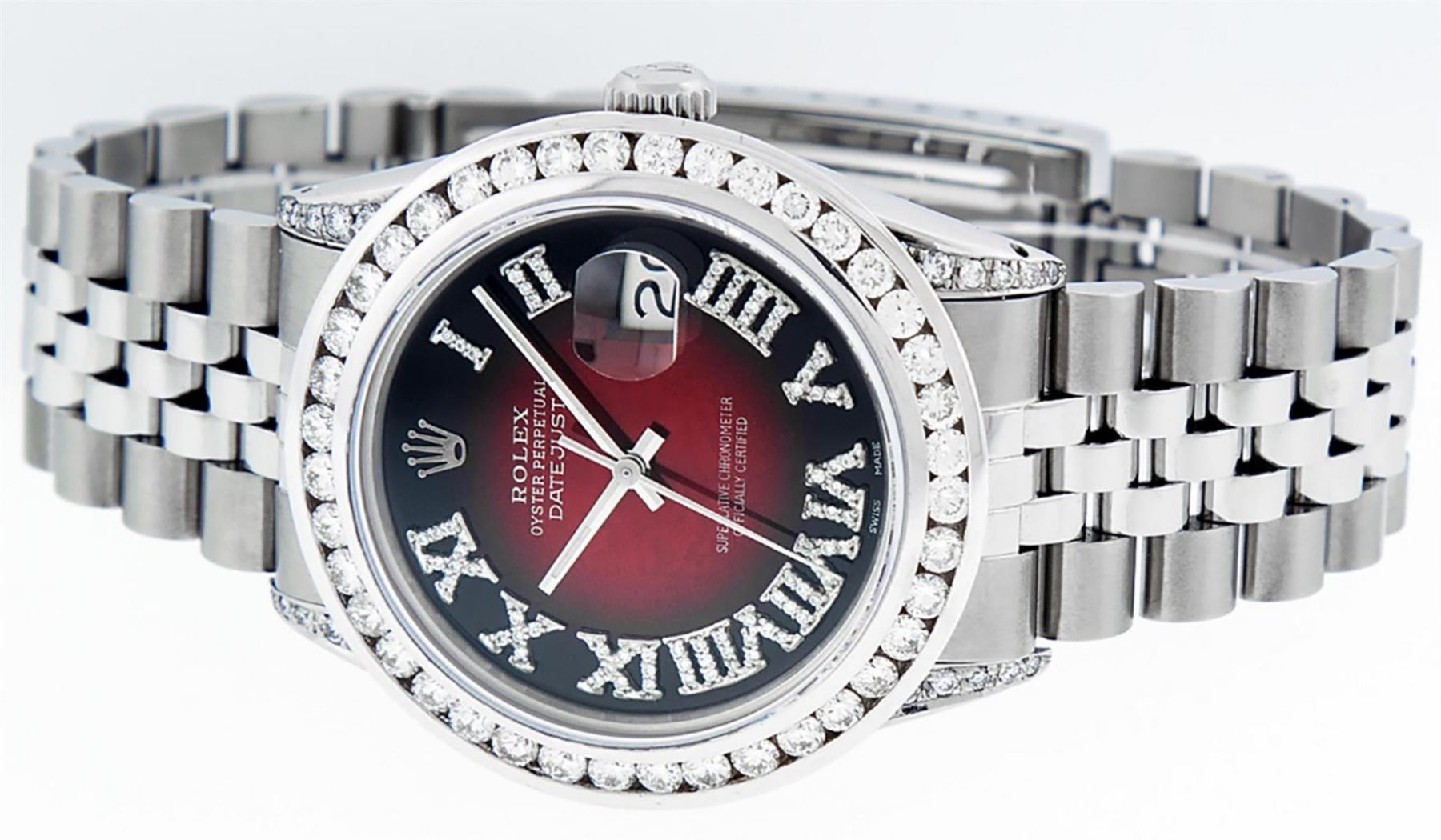 One Mens Stainless Steel Rolex Datejust Polished Bright with Satin Finish, Serviced & Electronically Tested, Stainless Steel Case: 36mm, Diamond Lugs: 24 Diamonds On Lugs, Color: G to H, Clarity: SI-VS. Stainless Steel Crown, New Custom Bezel: 18K White Gold 3.00 Ctw Diamond Bezel, Diamond Count: 40 Diamonds, Total Weight 3.0 Carat, Clarity: SI-VS, Color: G to H. Custom Crystal: New Scratch Resistant Synthetic Sapphire Cyclops Lens. Movement: Automatic Winding Movement Caliber 3035. Custom Dial: Red Vignette Roman Diamond Dial, Diamond Color: G To H In Color, Clarity: SI-VS. Date Window: 3 O'Clock Position Date Display, Quickset, Model: Quickset Datejust, Condition: G-6 Extra Fine. Bracelet: Stainless Steel Jubilee Band. Bright Polish & Satin Finish. 7.0 Inch Length, Adjustable. Standard Clasp, With Rolex Logo. This Watch Has Been Serviced Time Tested And Is In Excellent Condition It Is Free Of All Scratches And Dents. This Watch Also Comes With A Brand New Wooden Watch Winder.