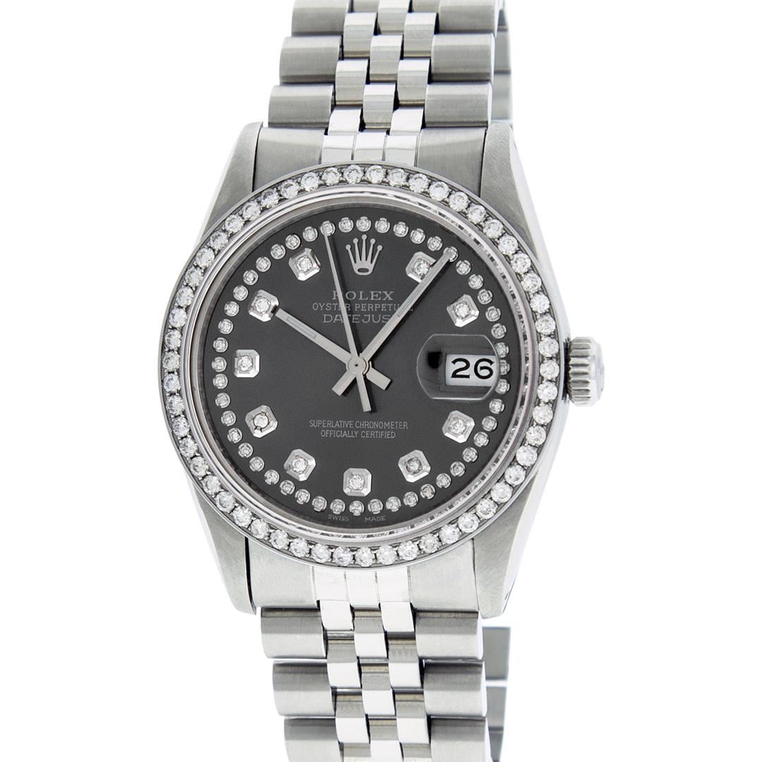 One Mens Rolex Stainless Steel Datejust Polished Bright with Satin Finish, This Watch Has Been Serviced & Electronically Tested, Stainless Steel Case: 36mm, Stainless Steel Crown, Custom Bezel: New Stainless Steel Beadset Diamond Bezel, Diamond Count: 54 Diamonds, Total Weight 1.00 Carat, Clarity: SI-VS, Color: G to H. Custom Crystal: New Synthetic Sapphire Cyclops Lens. Custom Hands: New Luminescent Hands. Movement: Automatic Winding Movement Caliber 3035. Custom Dial: Rhodium String Diamond Dial, Diamond Count: 58 Diamonds In Dial, Color: G to H, Clarity: VS2-SI1. Date Window: 3 O'Clock Position Date Display, Quickset, Model: Datejust. Condition: G-6 Extra Fine. Bracelet: Stainless Steel Jubilee Band. Bright Polish & Satin Finish. 7.0 Inch Length, Adjustable. Standard Clasp, With Rolex Logo. This Watch Has Been Serviced Time Tested And Is In Excellent Condition It Is Free Of All Scratches And Dents.