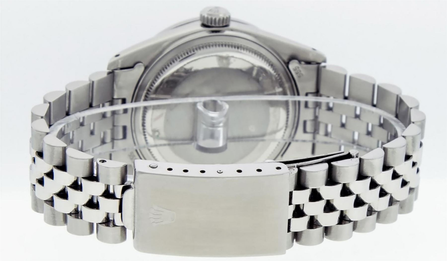 One Mens Rolex Stainless Steel Datejust Polished Bright with Satin Finish, This Watch Has Been Serviced & Electronically Tested, Stainless Steel Case: 36mm, Stainless Steel Crown, Custom Bezel: New Stainless Steel Beadset Diamond Bezel, Diamond Count: 54 Diamonds, Total Weight 1.00 Carat, Clarity: SI-VS, Color: G to H. Custom Crystal: New Synthetic Sapphire Cyclops Lens. Custom Hands: New Luminescent Hands. Movement: Automatic Winding Movement Caliber 3035. Custom Dial: Rhodium String Diamond Dial, Diamond Count: 58 Diamonds In Dial, Color: G to H, Clarity: VS2-SI1. Date Window: 3 O'Clock Position Date Display, Quickset, Model: Datejust. Condition: G-6 Extra Fine. Bracelet: Stainless Steel Jubilee Band. Bright Polish & Satin Finish. 7.0 Inch Length, Adjustable. Standard Clasp, With Rolex Logo. This Watch Has Been Serviced Time Tested And Is In Excellent Condition It Is Free Of All Scratches And Dents.