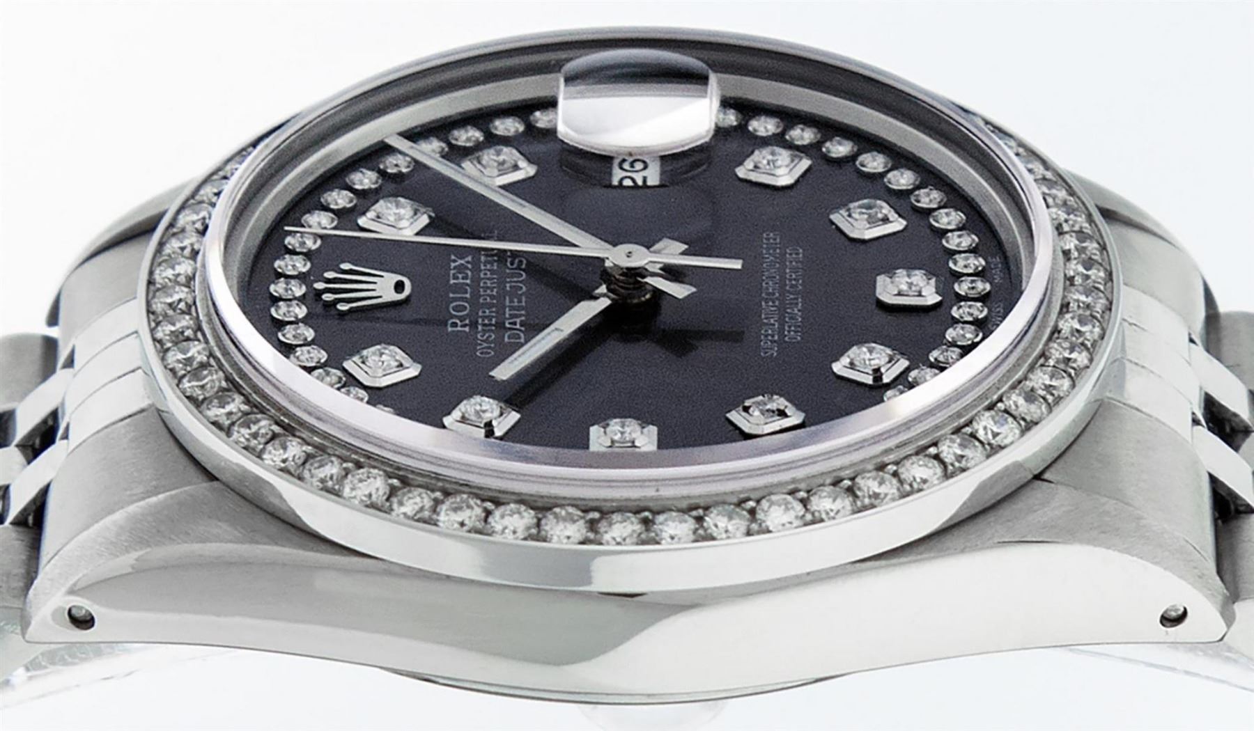 One Mens Rolex Stainless Steel Datejust Polished Bright with Satin Finish, This Watch Has Been Serviced & Electronically Tested, Stainless Steel Case: 36mm, Stainless Steel Crown, Custom Bezel: New Stainless Steel Beadset Diamond Bezel, Diamond Count: 54 Diamonds, Total Weight 1.00 Carat, Clarity: SI-VS, Color: G to H. Custom Crystal: New Synthetic Sapphire Cyclops Lens. Custom Hands: New Luminescent Hands. Movement: Automatic Winding Movement Caliber 3035. Custom Dial: Rhodium String Diamond Dial, Diamond Count: 58 Diamonds In Dial, Color: G to H, Clarity: VS2-SI1. Date Window: 3 O'Clock Position Date Display, Quickset, Model: Datejust. Condition: G-6 Extra Fine. Bracelet: Stainless Steel Jubilee Band. Bright Polish & Satin Finish. 7.0 Inch Length, Adjustable. Standard Clasp, With Rolex Logo. This Watch Has Been Serviced Time Tested And Is In Excellent Condition It Is Free Of All Scratches And Dents.