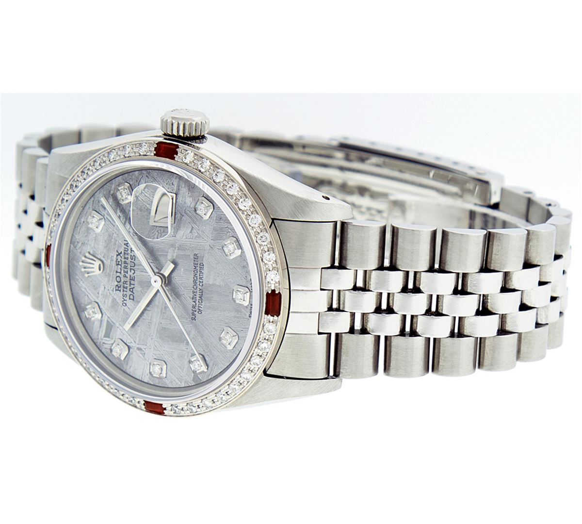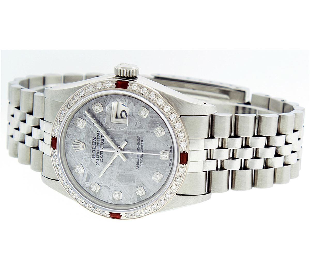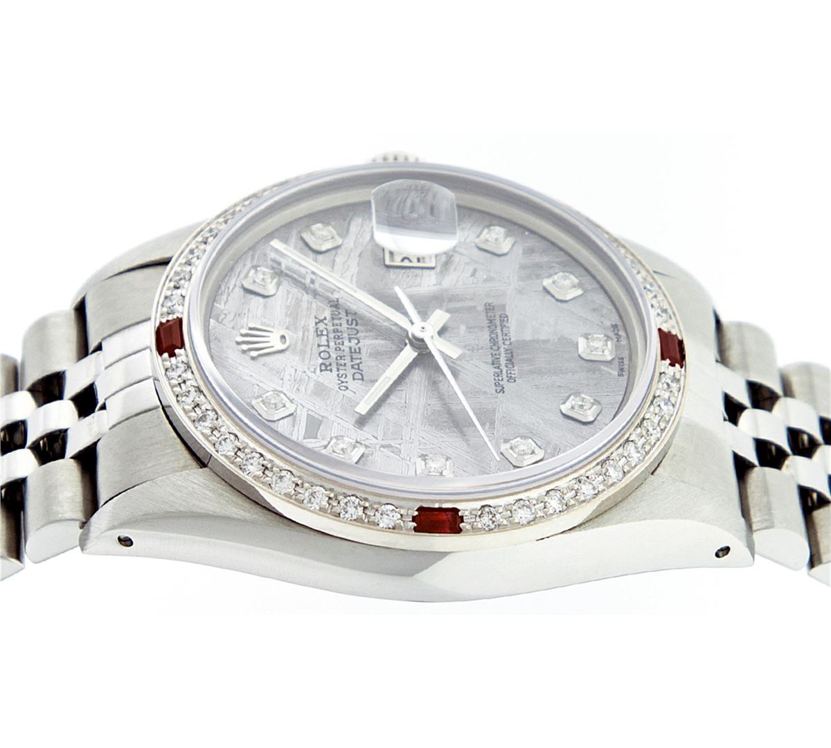 One Mens Stainless Steel Rolex Datejust Polished Bright with Satin Finish, Fully Serviced & Electronically Tested, Stainless Steel Case: 36mm, Stainless Steel Crown, Custom Bezel: 18K White Gold Ruby Beadset Diamond Bezel, Diamond Count: 36 Diamonds + 4 Rubies, Total Weight 1.00 Carat, Clarity: SI-VS, Color: G to H. Custom Crystal: Synthetic Sapphire Cyclops Lens. Movement: Automatic Winding Movement Caliber 3035. Custom Dial: Meteorite Diamond Dial, 10 Diamonds in Dial, G To H In Color, Clarity: SI-VS. Date Window: 3 O'Clock Position Date Display, Quickset, Model: Datejust, Condition: G-6 Extra Fine. Bracelet:Stainless Steel Jubilee. Bright Polish & Satin Finish. 6.5 Inch Length, Adjustable. Standard Clasp, With Rolex Logo.
