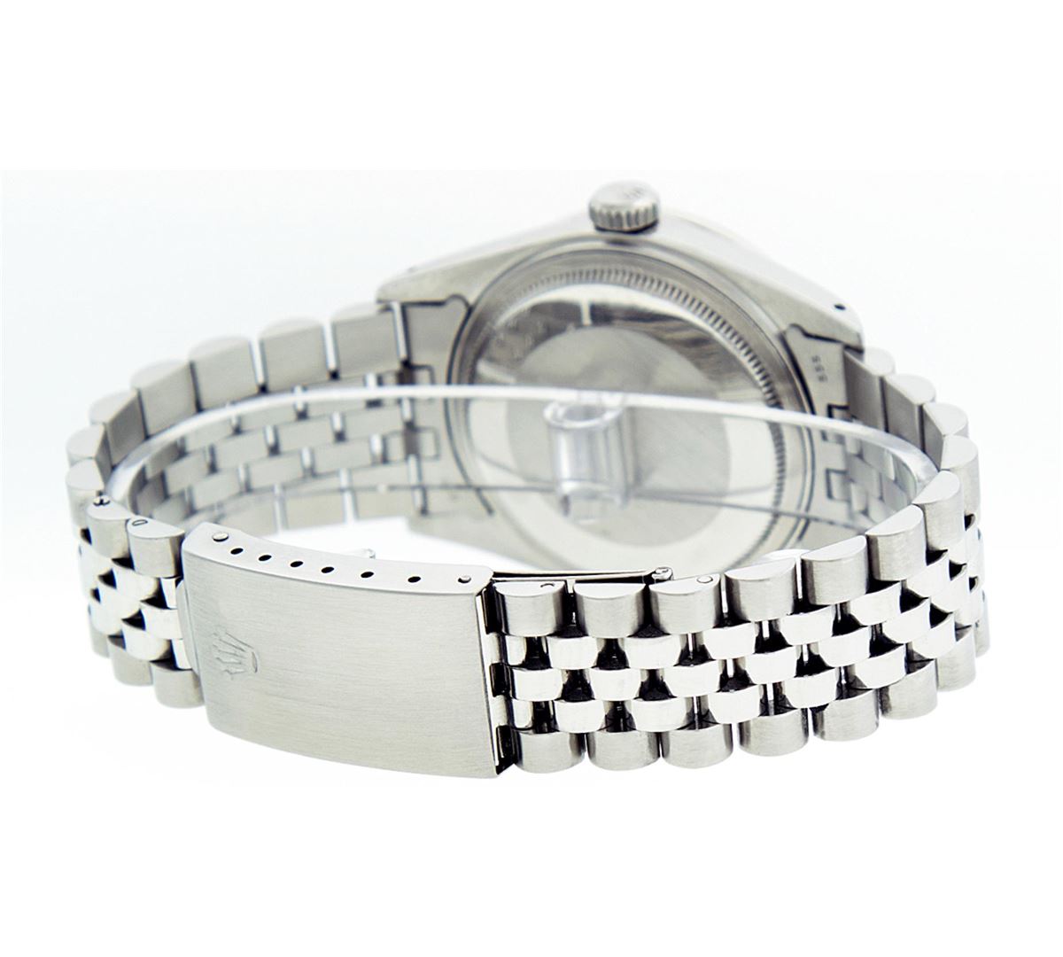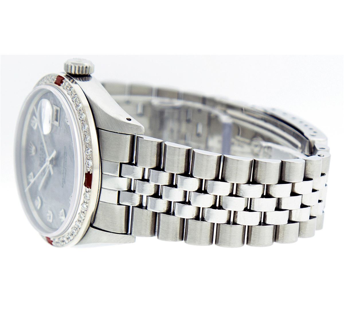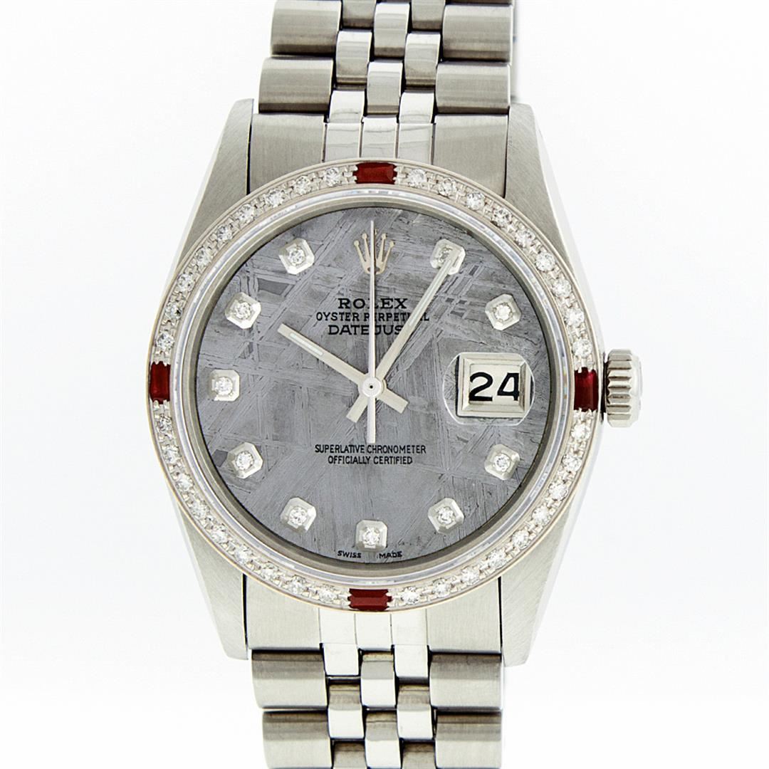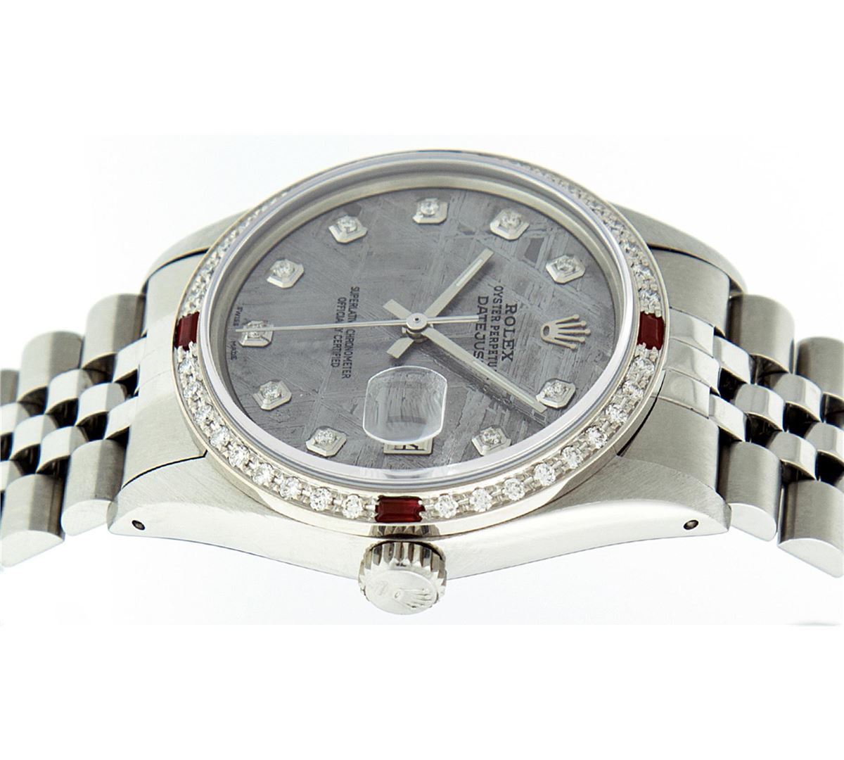 One Mens Stainless Steel Rolex Datejust Polished Bright with Satin Finish, Fully Serviced & Electronically Tested, Stainless Steel Case: 36mm, Stainless Steel Crown, Custom Bezel: 18K White Gold Ruby Beadset Diamond Bezel, Diamond Count: 36 Diamonds + 4 Rubies, Total Weight 1.00 Carat, Clarity: SI-VS, Color: G to H. Custom Crystal: Synthetic Sapphire Cyclops Lens. Movement: Automatic Winding Movement Caliber 3035. Custom Dial: Meteorite Diamond Dial, 10 Diamonds in Dial, G To H In Color, Clarity: SI-VS. Date Window: 3 O'Clock Position Date Display, Quickset, Model: Datejust, Condition: G-6 Extra Fine. Bracelet:Stainless Steel Jubilee. Bright Polish & Satin Finish. 6.5 Inch Length, Adjustable. Standard Clasp, With Rolex Logo.