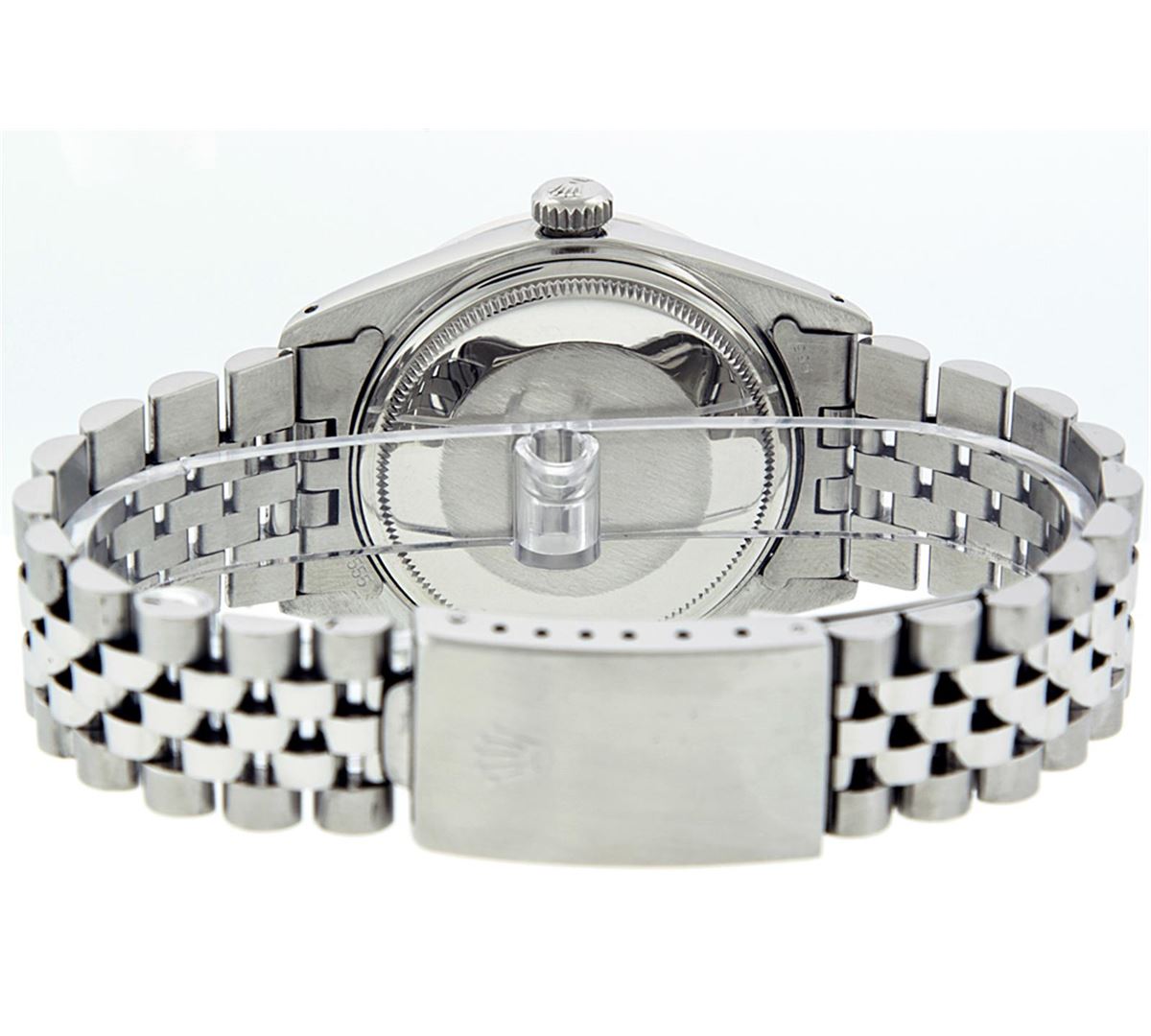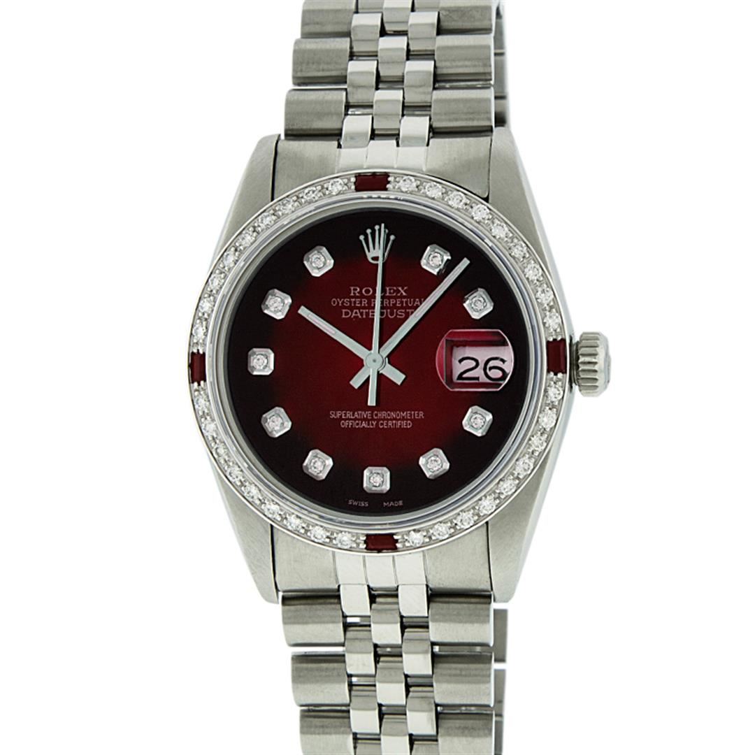 One Mens Rolex Datejust Polished, Serviced & Electronically Tested, Stainless Steel Case:36mm, Stainless Steel Crown, Custom Bezel: 18K White Gold Ruby Beadset Diamond Bezel, Diamond + Gem Count: 36 Diamonds + 4 Rubies Total Weight 1.00 Carat, Clarity: SI-VS, Color: G to H. Custom Crystal: Synthetic Sapphire Cyclops Lens. Movement: Automatic Winding Movement Caliber 3035. Custom Dial: Red Vignette With Diamond Hour Markers, 10 Diamond Dial G To H In Color, Clarity: SI-VS. Date Window: 3 O'Clock Position Date Display, Quickset, Model: Datejust. Condition: G-6 Extra Fine. Bracelet: Stainless Steel Jubilee. Bright Polish & Satin Finish. 7.0 Inch Length, Adjustable. Standard Clasp, With Rolex Logo