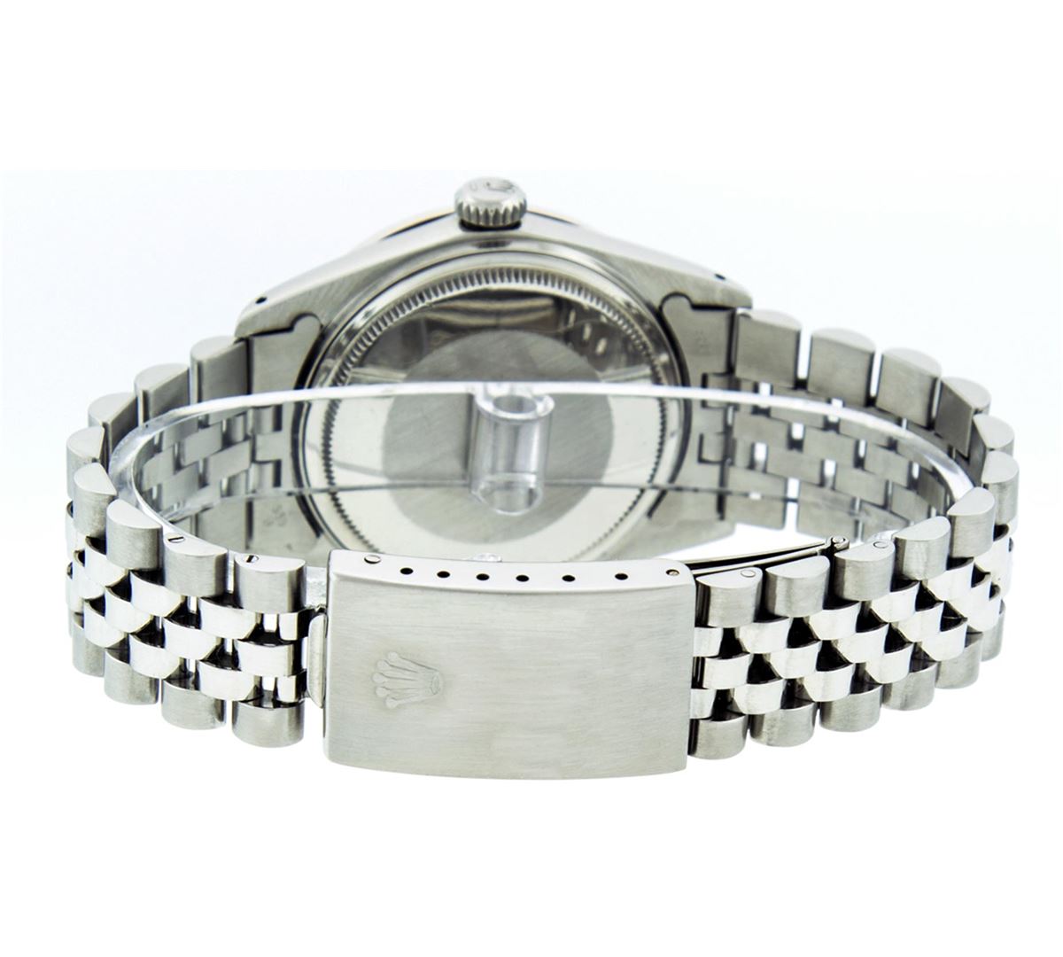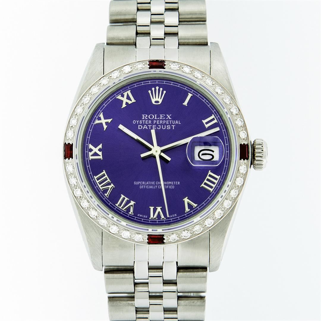 One Mens Rolex Datejust Polished Bright with Satin Finish, Serviced & Electronically Tested, Stainless Steel Case:36mm, Stainless Steel Crown, Custom Bezel: 18K White Gold Ruby Beadset Diamond Bezel, Diamond + Gem Count: 36 Diamonds + 4 Rubies. Total Weight 1.00 Carat, Clarity: Si-VS, Color: G to H. Custom Crystal: Synthetic Sapphire Cyclops Lens. Movement: Automatic Winding Movement Caliber 3035. Custom Dial: Purple Roman Dial With Square Track. Date Window: 3 O'Clock Position Date Display, Quickset, Model: Datejust. Condition: G-6 Extra Fine. Bracelet:Stainless Steel Jubilee. Bright Polish & Satin Finish. 7.0 Inch Length, Adjustable. Standard Clasp, With Rolex Logo.