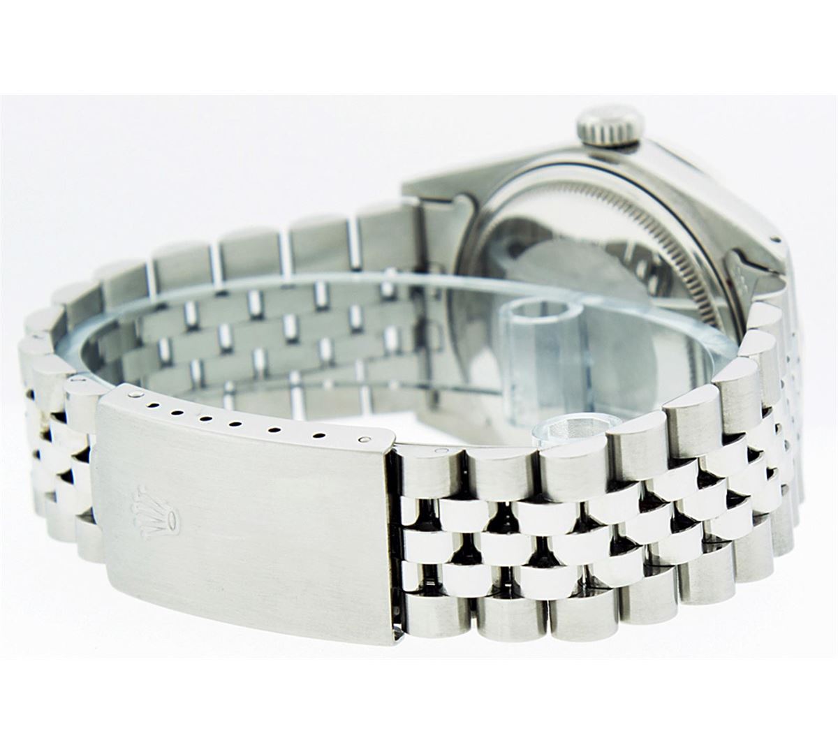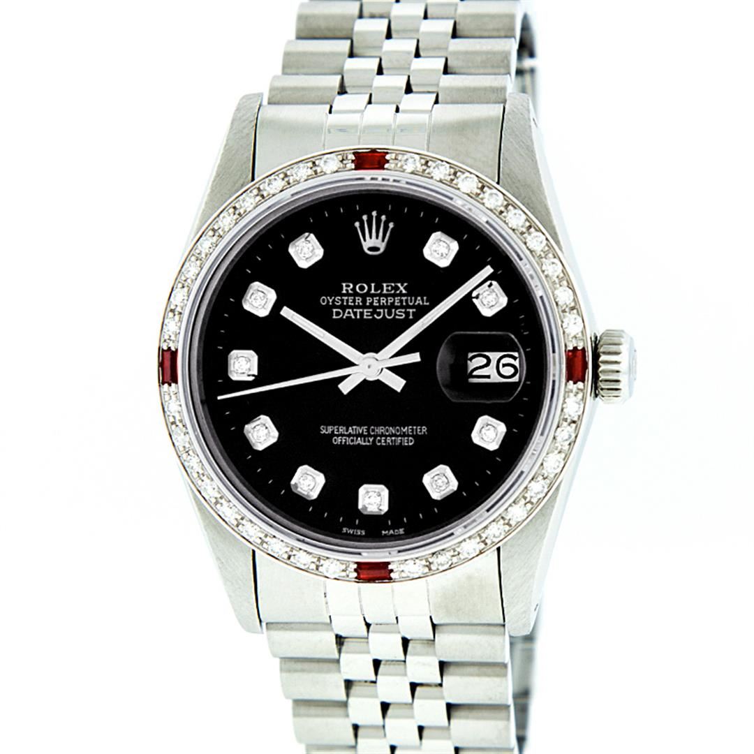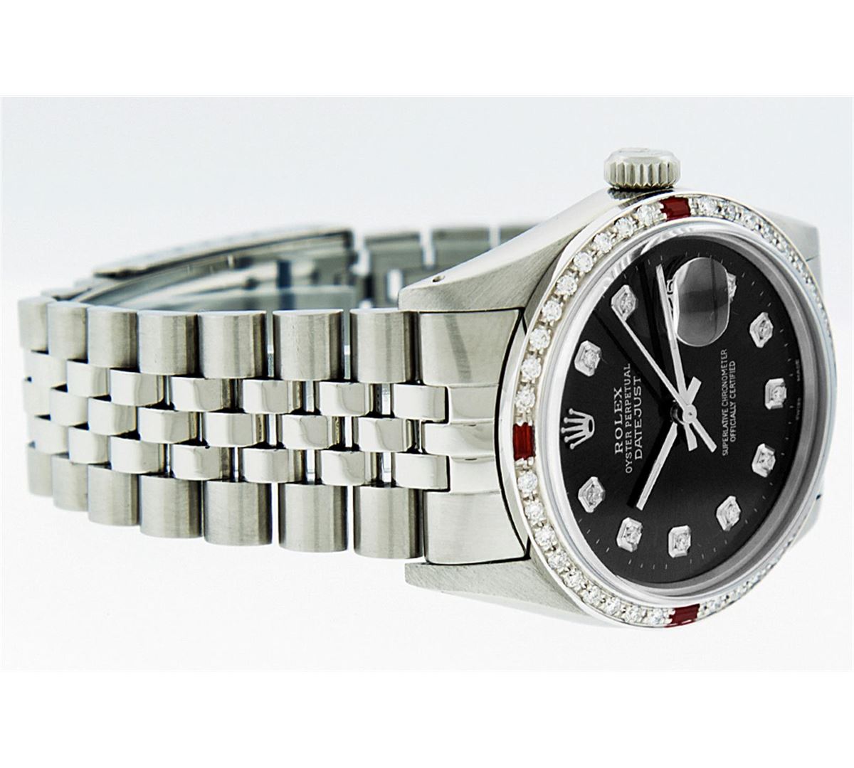 One Mens Rolex Datejust Polished Bright with Satin Finish, Serviced & Electronically Tested, Stainless Steel Case:36mm, Stainless Steel Crown, Custom Bezel: 18K White Gold Ruby Beadset Diamond Bezel, Diamond + Gem Count: 36 Diamonds + 4 Rubies. Total Weight 1.00 Carat, Clarity: Si-VS, Color: G to H. Custom Crystal: Synthetic Sapphire Cyclops Lens. Movement: Automatic Winding Movement Caliber 3035. Custom Dial: Black Diamond Dial, 10 Diamond in Dial G To H In Color, Si-VS Clarity. Date Window: 3 O'Clock Position Date Display, Quickset, Model:Datejust. Condition: G-6 Extra Fine. Bracelet:Stainless Steel Jubilee. Bright Polish & Satin Finish. 7.0 Inch Length, Adjustable. Standard Clasp, With Rolex Logo.