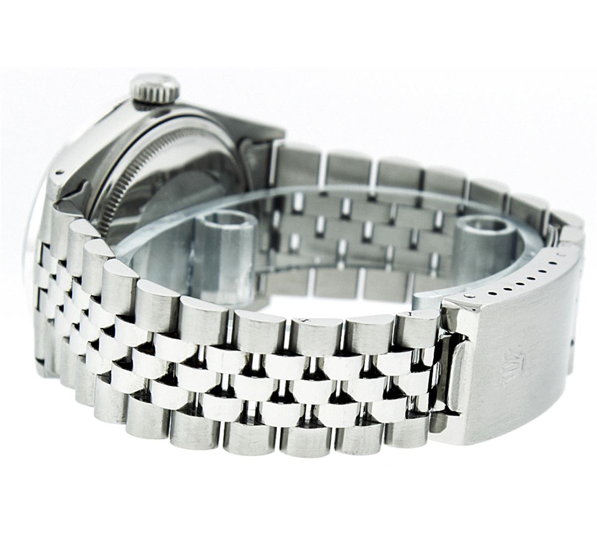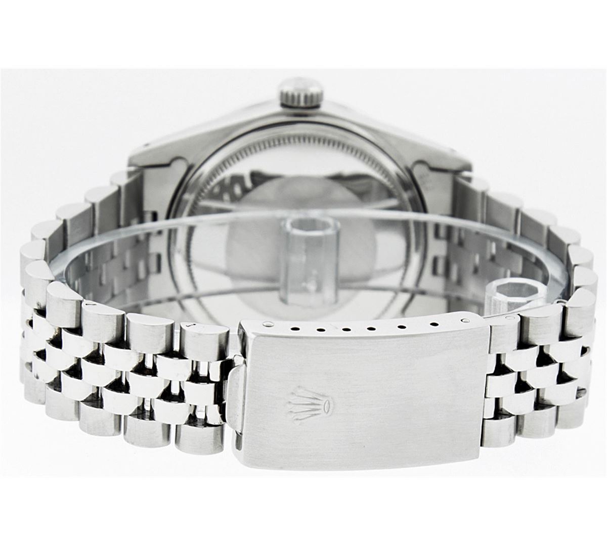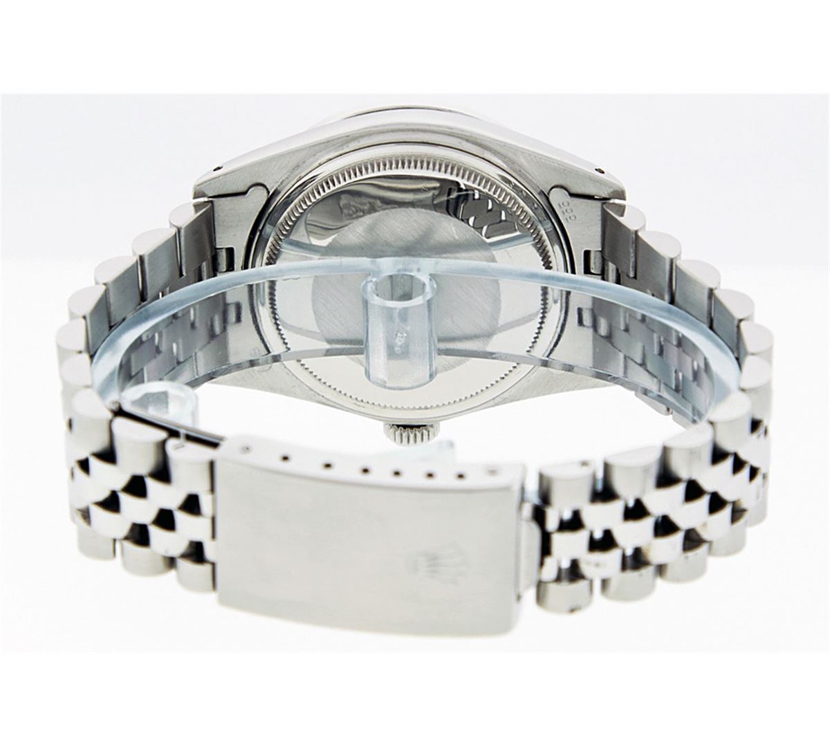 One Mens Rolex Datejust Polished Bright with Satin Finish, Serviced & Electronically Tested, Stainless Steel Case:36mm, Stainless Steel Crown, Custom Bezel: 18K White Gold Ruby Beadset Diamond Bezel, Diamond + Gem Count: 36 Diamonds + 4 Rubies. Total Weight 1.00 Carat, Clarity: Si-VS, Color: G to H. Custom Crystal: Synthetic Sapphire Cyclops Lens. Movement: Automatic Winding Movement Caliber 3035. Custom Dial: Black Diamond Dial, 10 Diamond in Dial G To H In Color, Si-VS Clarity. Date Window: 3 O'Clock Position Date Display, Quickset, Model:Datejust. Condition: G-6 Extra Fine. Bracelet:Stainless Steel Jubilee. Bright Polish & Satin Finish. 7.0 Inch Length, Adjustable. Standard Clasp, With Rolex Logo.