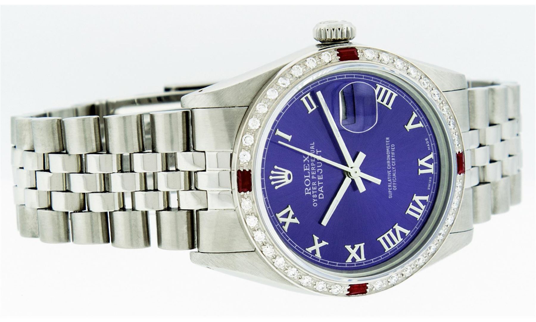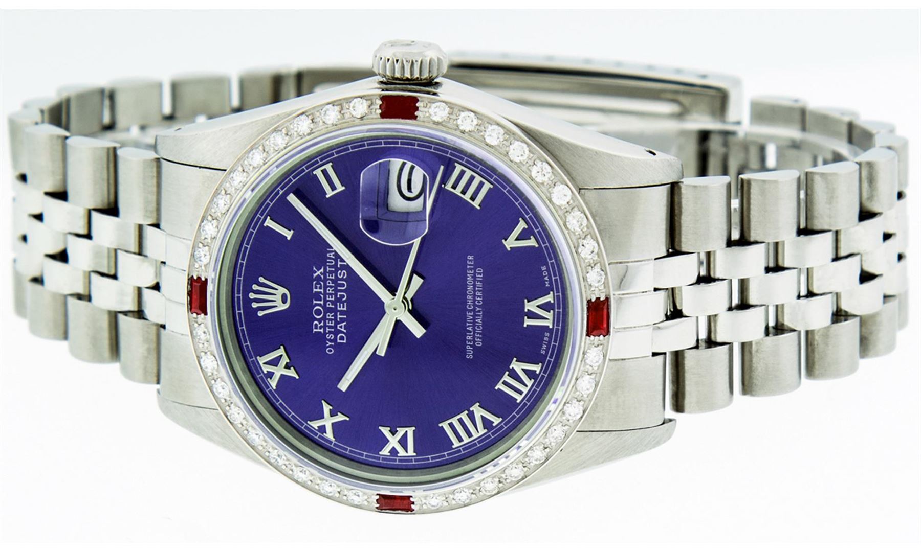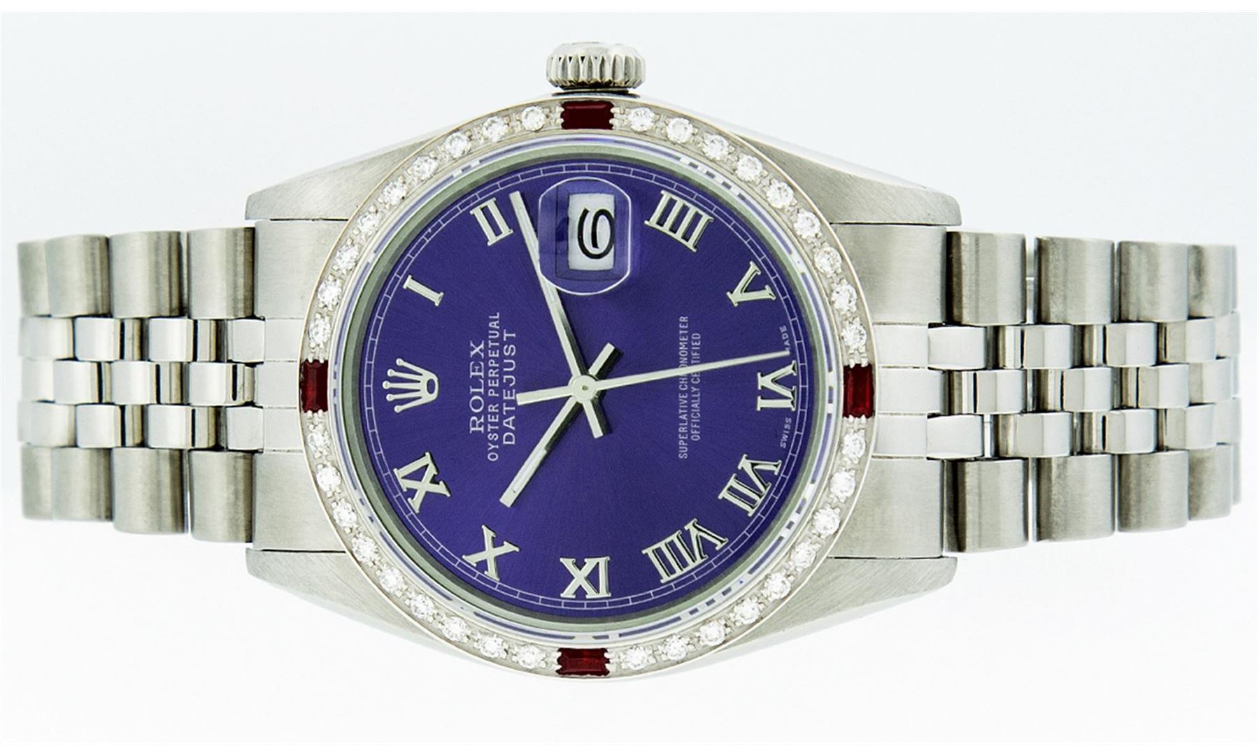 One Mens Rolex Datejust Polished Bright with Satin Finish, Serviced & Electronically Tested, Stainless Steel Case:36mm, Stainless Steel Crown, Custom Bezel: 18K White Gold Ruby Beadset Diamond Bezel, Diamond + Gem Count: 36 Diamonds + 4 Rubies. Total Weight 1.00 Carat, Clarity: Si-VS, Color: G to H. Custom Crystal: Synthetic Sapphire Cyclops Lens. Movement: Automatic Winding Movement Caliber 3035. Custom Dial: Purple Roman Dial With Square Track. Date Window: 3 O'Clock Position Date Display, Quickset, Model: Datejust. Condition: G-6 Extra Fine. Bracelet:Stainless Steel Jubilee. Bright Polish & Satin Finish. 7.0 Inch Length, Adjustable. Standard Clasp, With Rolex Logo.