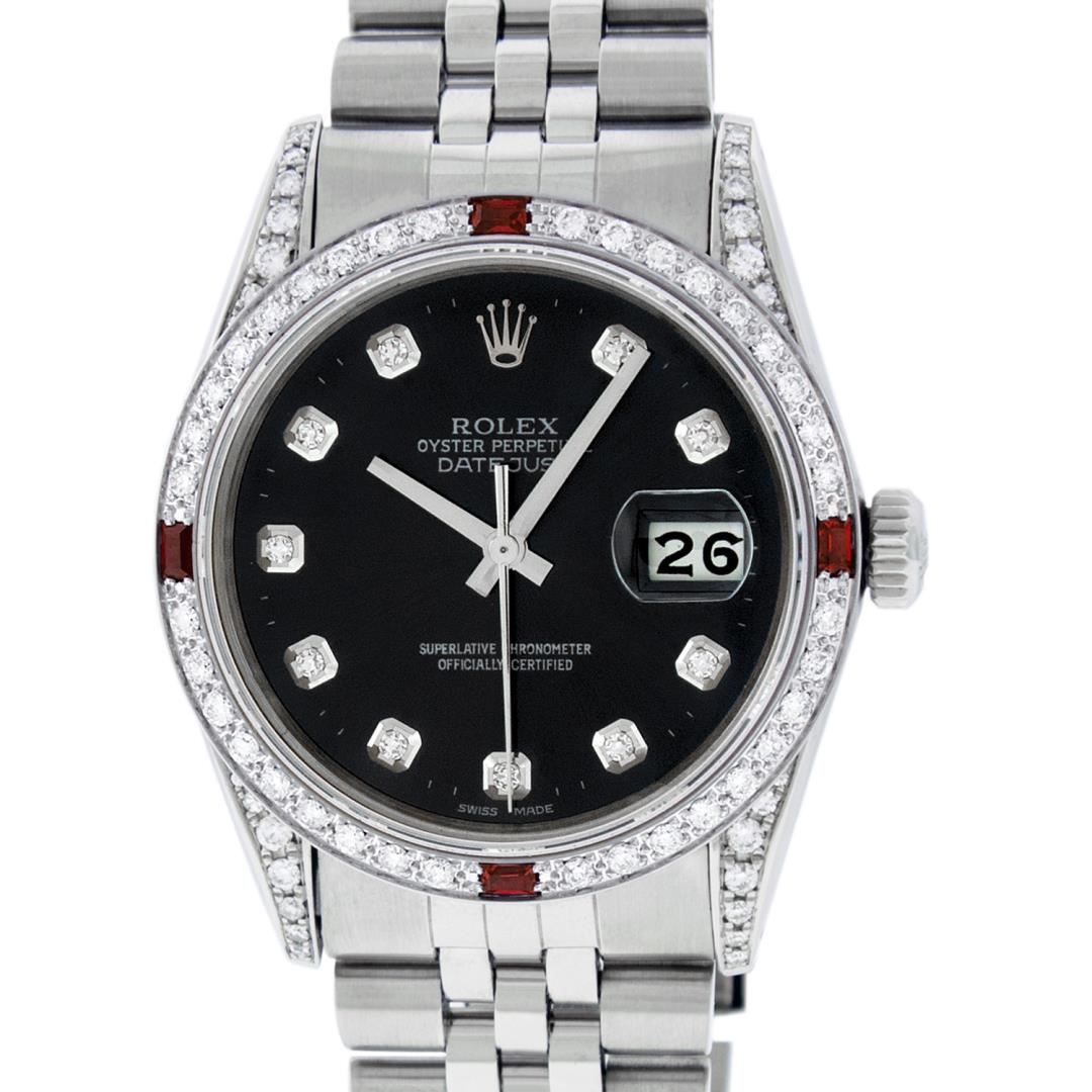 One 36MM Stainless Steel Pre Owned Rolex Datejust Polished Bright with Satin Finish, Serviced & Electronically Tested, Rolex Stainless Steel Case: 36mm, Custom Diamond Lugs: Custom Added 28 Diamonds On Lugs. Rolex Stainless Steel Crown, Custom Bezel: New 18K White Gold Diamond + Ruby Beadset, Diamond Count: 36 Diamonds + 4 Rubies. Custom Crystal: New Sapphire With Date Window. Custom Hands: New Hands. Rolex Movement: Automatic Winding Movement 3035. Custom Dial: Custom Black Dial With Custom Added Diamonds, Stone Count: 10 Diamonds. Date Window: 3 O'Clock Position Date Display, Quickset, Model: Datejust Condition: G-6 Extra Fine. Rolex Bracelet: Stainless Steel Jubilee Band. Bright Polish & Satin Finish. 7.0 Inch Length, Adjustable. Fold Clasp, With Rolex Logo. This Watch Has Been Serviced And Polished And Its Free Of All Dents And Scratches.
