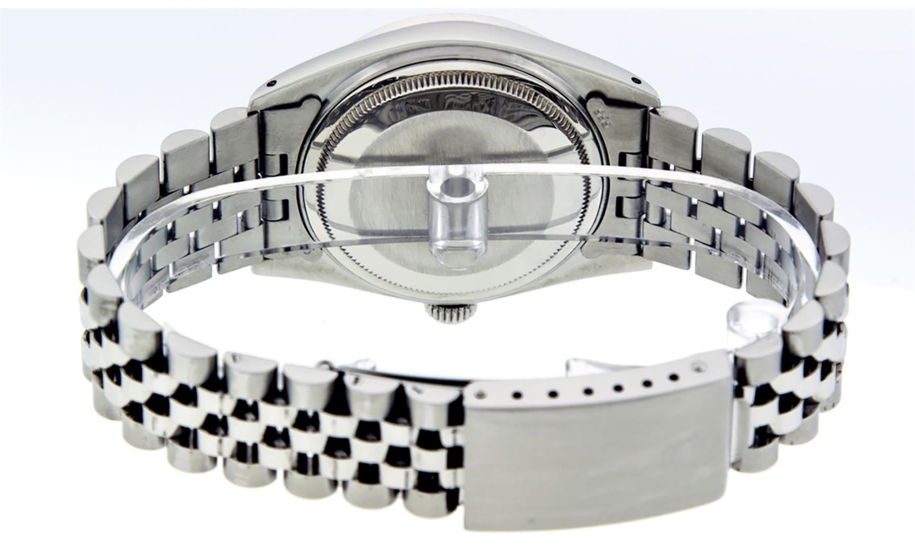 One Pre Owned Stainless Steel Rolex 36MM Datejust Polished Bright with Satin Finish, Serviced & Electronically Tested, Stainless Steel Case: 36mm, Custom Diamond Lugs: 28 Added Diamonds On Lugs. Stainless Steel Crown, Custom Bezel: New 18K White Gold Diamond + Ruby Beadset Bezel, Diamond Count: 36 Diamonds + 4 Rubies. Custom Crystal: New Sapphire With Magnified Date Window. Custom Hands: New Luminescent Hands. Rolex Movement: Automatic Winding Movement 3035. Custom Dial: Custom White Dial With Added Diamond Hour Markers. Date Window: 3 O'Clock Position Date Display, Quickset, Model: Datejust Condition: G-6 Extra Fine. Rolex Bracelet: Stainless Steel Jubilee Band. Bright Polish & Satin Finish. 7.0 Inch Length, Adjustable. Fold Clasp, With Rolex Logo. This Watch Has Been Serviced And Polished And Its Free Of All Dents And Scratches.
