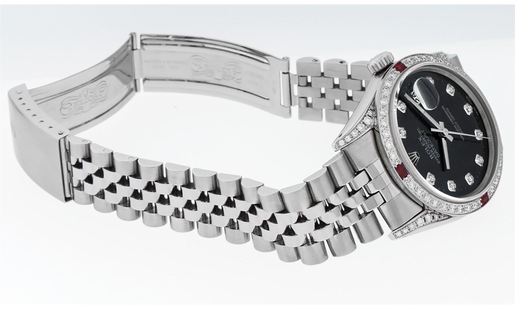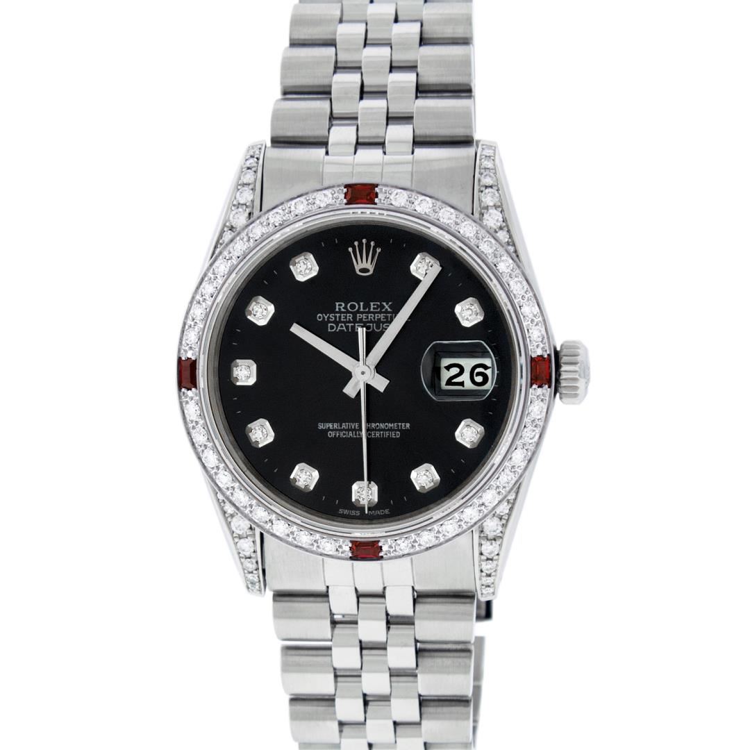 One 36MM Stainless Steel Pre Owned Rolex Datejust Polished Bright with Satin Finish, Serviced & Electronically Tested, Rolex Stainless Steel Case: 36mm, Custom Diamond Lugs: Custom Added 28 Diamonds On Lugs. Rolex Stainless Steel Crown, Custom Bezel: New 18K White Gold Diamond + Ruby Beadset, Diamond Count: 36 Diamonds + 4 Rubies. Custom Crystal: New Sapphire With Date Window. Custom Hands: New Hands. Rolex Movement: Automatic Winding Movement 3035. Custom Dial: Custom Black Dial With Custom Added Diamonds, Stone Count: 10 Diamonds. Date Window: 3 O'Clock Position Date Display, Quickset, Model: Datejust Condition: G-6 Extra Fine. Rolex Bracelet: Stainless Steel Jubilee Band. Bright Polish & Satin Finish. 7.0 Inch Length, Adjustable. Fold Clasp, With Rolex Logo. This Watch Has Been Serviced And Polished And Its Free Of All Dents And Scratches.
