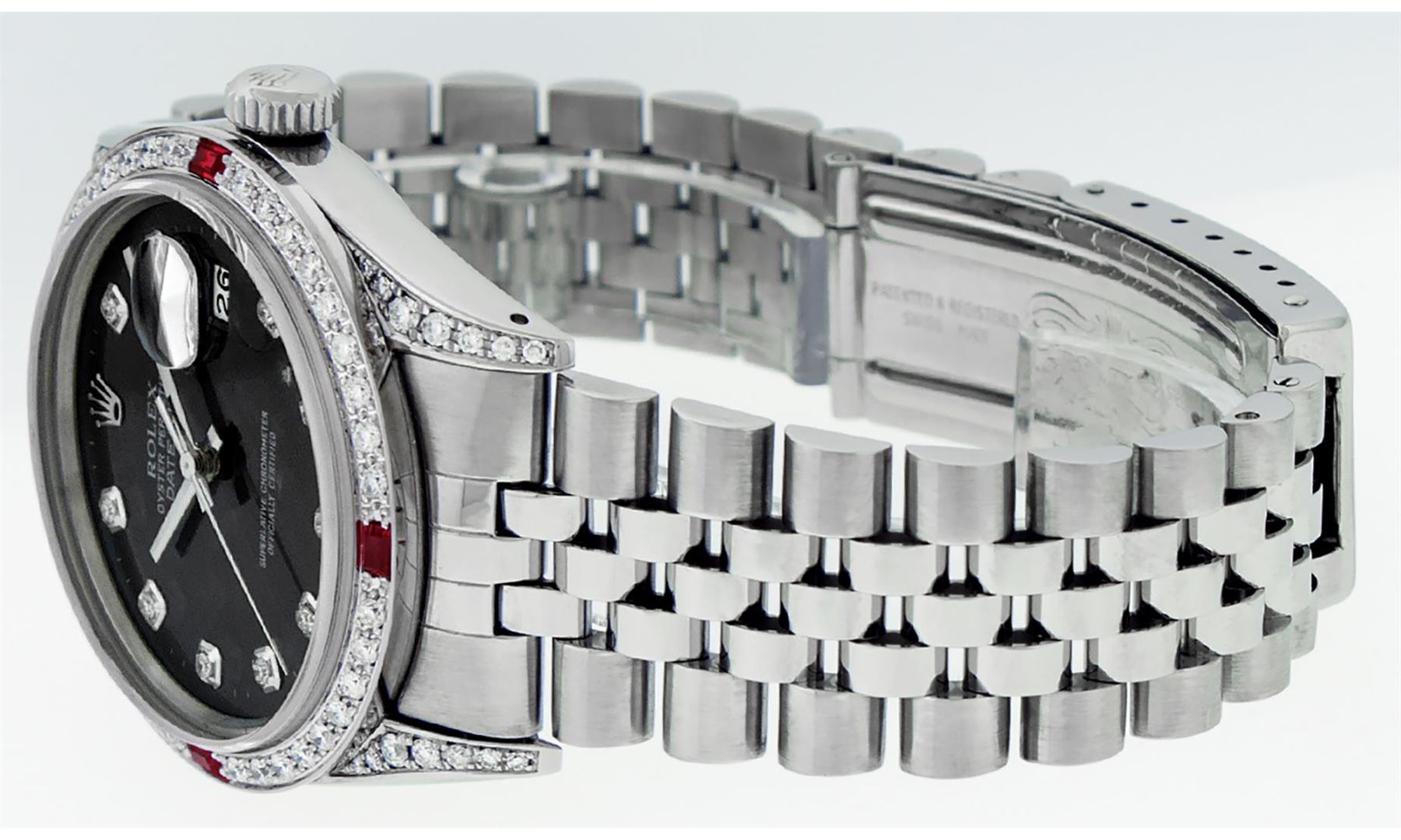 One 36MM Stainless Steel Pre Owned Rolex Datejust Polished Bright with Satin Finish, Serviced & Electronically Tested, Rolex Stainless Steel Case: 36mm, Custom Diamond Lugs: Custom Added 28 Diamonds On Lugs. Rolex Stainless Steel Crown, Custom Bezel: New 18K White Gold Diamond + Ruby Beadset, Diamond Count: 36 Diamonds + 4 Rubies. Custom Crystal: New Sapphire With Date Window. Custom Hands: New Hands. Rolex Movement: Automatic Winding Movement 3035. Custom Dial: Custom Black Dial With Custom Added Diamonds, Stone Count: 10 Diamonds. Date Window: 3 O'Clock Position Date Display, Quickset, Model: Datejust Condition: G-6 Extra Fine. Rolex Bracelet: Stainless Steel Jubilee Band. Bright Polish & Satin Finish. 7.0 Inch Length, Adjustable. Fold Clasp, With Rolex Logo. This Watch Has Been Serviced And Polished And Its Free Of All Dents And Scratches.