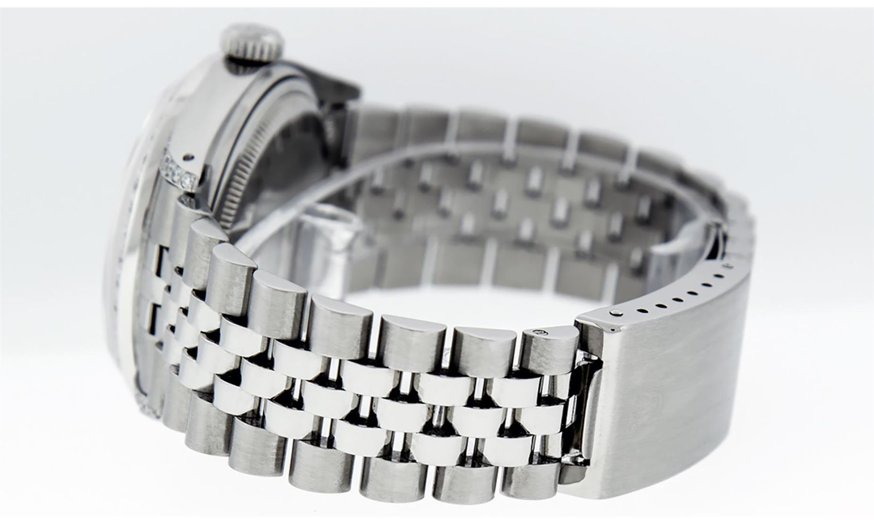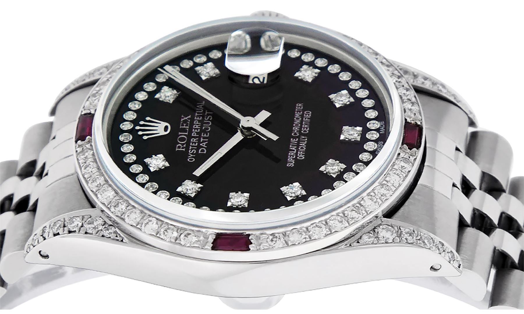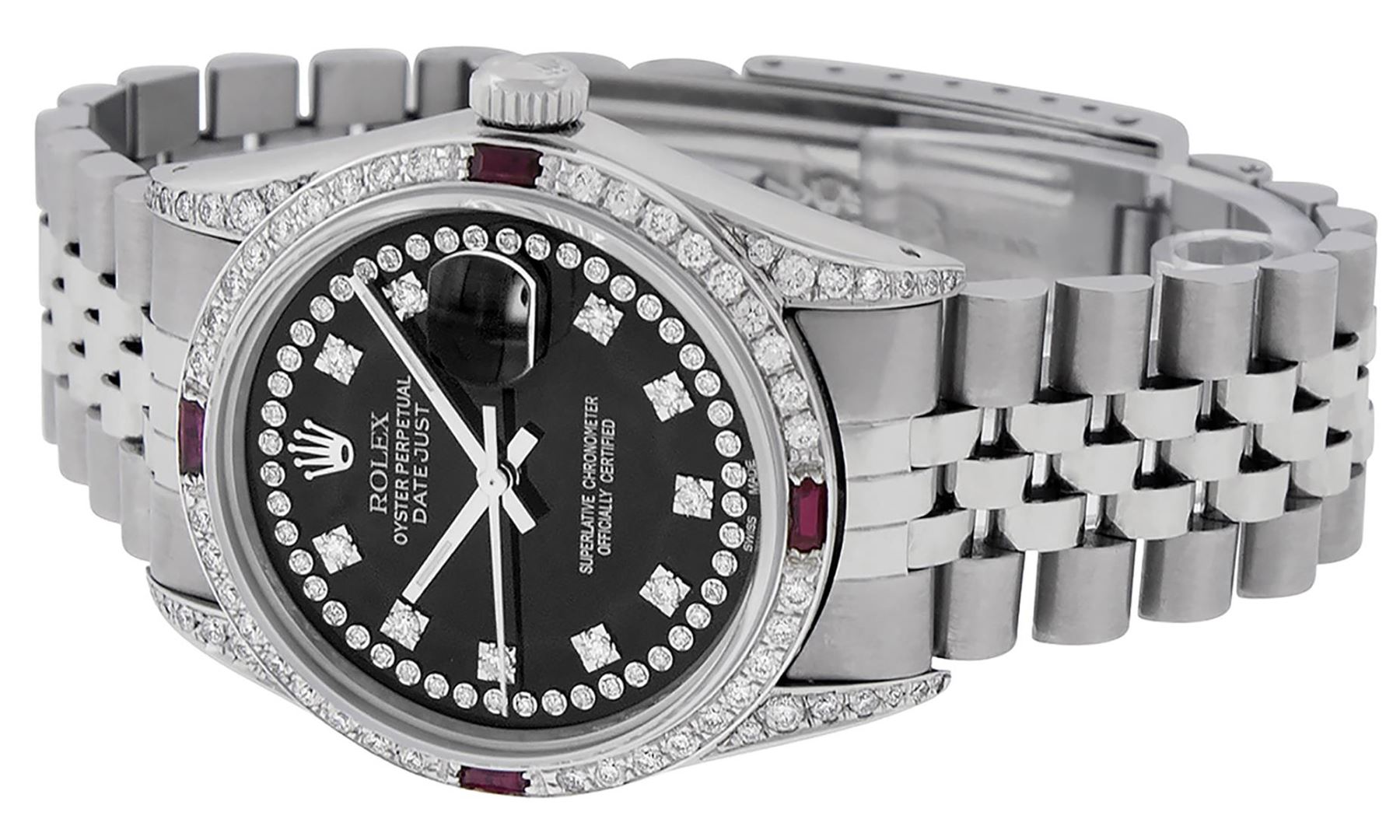 One Mens Pre Owned Rolex Datejust Polished Bright with Satin Finish, Serviced And Electronically Tested, Stainless Steel Case: 36mm, Custom Diamond Lugs: 28 Diamonds On Lugs, Stainless Steel Crown, Custom Bezel: 18K White Gold Diamond + Ruby Beadset, Diamond Count: 36 Diamonds + 4 Rubies. Custom Crystal: New Sapphire With Magnified Date Window. Custom Hands: New Luminescent Hands. Rolex Movement: Automatic Winding Movement 3035. Custom Dial:Custom Black Dial With Added Diamonds, Stone Count: 58 Diamonds In Dial. Date Window: 3 O'Clock Position Date Display, Quickset, Model: Datejust, Condition: G-6 Extra Fine. Rolex Bracelet: Stainless Steel Jubilee Band. Bright Polish And Satin Finish. 7.0 Inch Length, Adjustable. Standard Clasp, With Rolex Logo. This Watch Has Been Serviced And Polished And Its Free Of All Dents And Scratches.