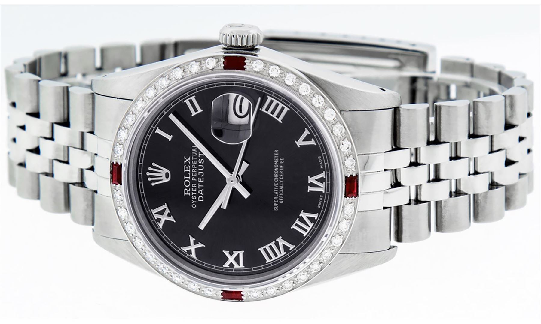 One Mens Stainless Steel Rolex Datejust Polished Bright with Satin Finish, This Watch Has Been Serviced & Electronically Tested, Stainless Steel Case: 36mm, Stainless Steel Crown, Custom Bezel: New 18K White Gold Ruby Beadset Diamond Bezel, Diamond + Gem Count: 36 Diamonds + 4 Rubies, Total Weight 1.00 Carat, Clarity: SI-VS, Color: G to H. Custom Crystal: New Scratch Resistant Synthetic Sapphire Cyclops Lens. Custom Hands: New Luminescent Hands. Movement: Automatic Winding Movement Caliber 3035. Custom Dial: Black With Roman Track. Date Window: 3 O'Clock Position Date Display, Quickset, Model: Datejust, Condition: G-6 Extra Fine. Bracelet: Stainless Steel Jubilee Band. Bracelet: 7.0 Inch Length, Adjustable. Standard Clasp, With Rolex Logo. This Watch Has Been Serviced Time Tested And Is In Excellent Condition It Is Free Of All Scratches And Dents.