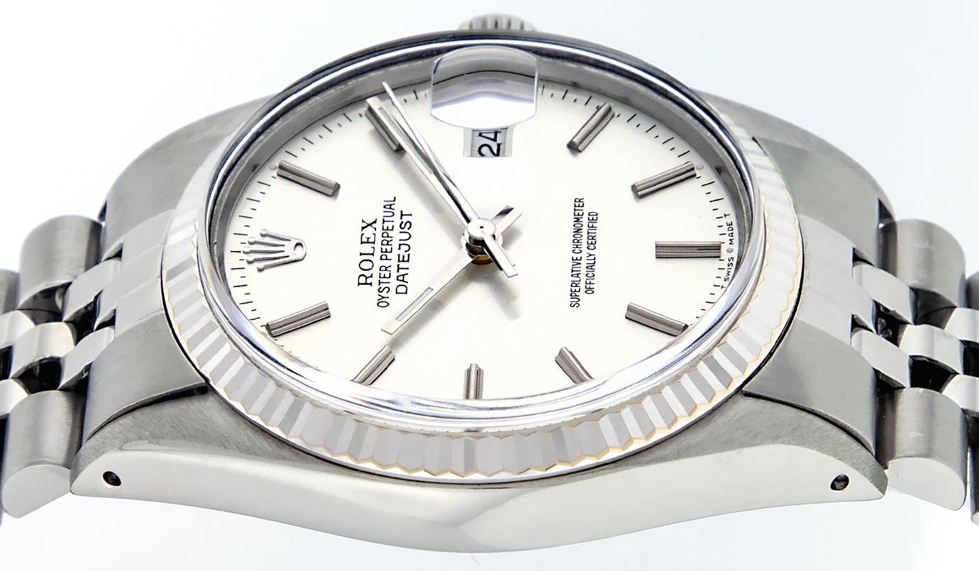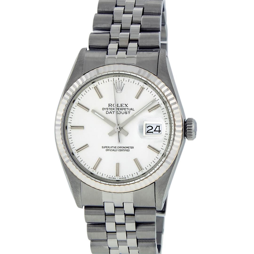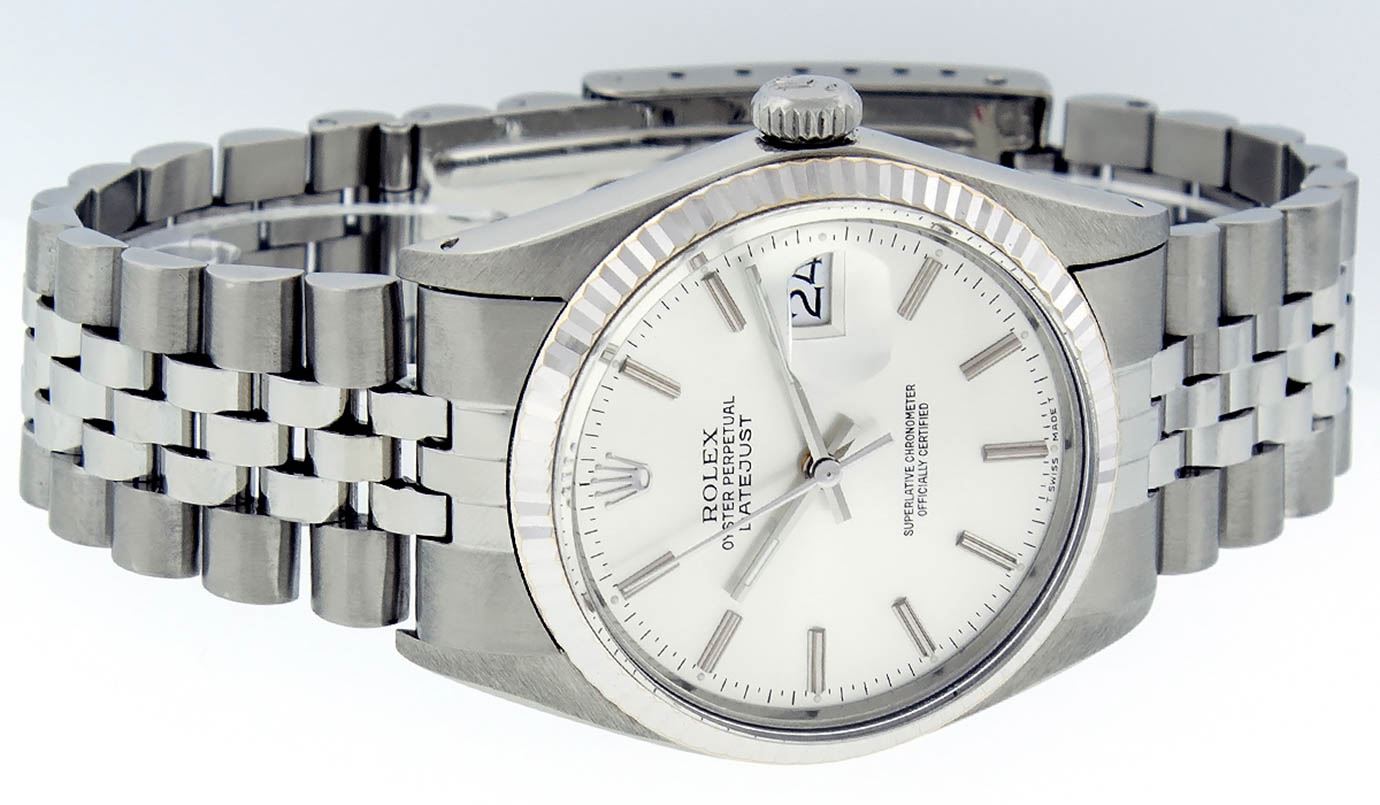 One Gents Rolex Datejust Polished, Serviced & Electronically Tested, Stainless Steel Case:36mm, Stainless Steel Crown, Bezel: 14K White Gold Fluted Bezel. Custom Crystal: Acrylic Cyclops Lens. Movement: Automatic Winding Movement Caliber 3035. Dial: Silver Index With Lumi Dots and Line Track. Date Window: 3 O'Clock Position Date Display, Quickset, Model: Datejust Condition: G-6 Extra Fine The Watch Is In Very Good Condition Free Of All Scratches And Dents. Bracelet: Stainless Steel Jubilee. Bright Polish & Satin Finish. 7 Inch Length, Adjustable. Standard Clasp, With Rolex Logo.