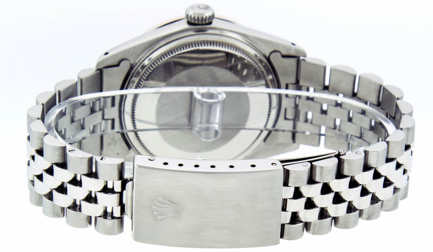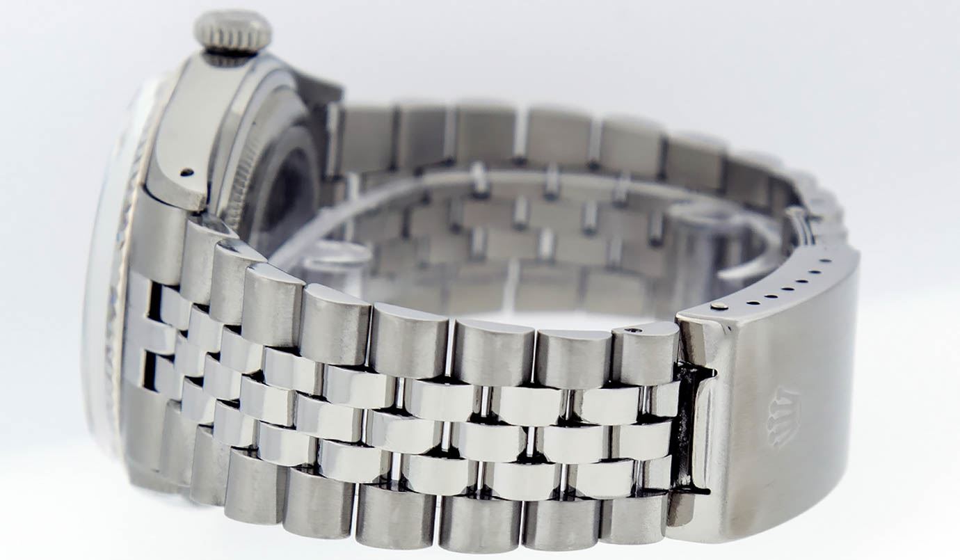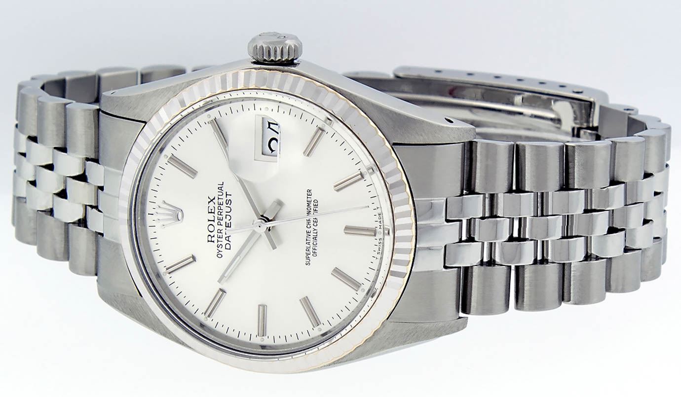 One Gents Rolex Datejust Polished, Serviced & Electronically Tested, Stainless Steel Case:36mm, Stainless Steel Crown, Bezel: 14K White Gold Fluted Bezel. Custom Crystal: Acrylic Cyclops Lens. Movement: Automatic Winding Movement Caliber 3035. Dial: Silver Index With Lumi Dots and Line Track. Date Window: 3 O'Clock Position Date Display, Quickset, Model: Datejust Condition: G-6 Extra Fine The Watch Is In Very Good Condition Free Of All Scratches And Dents. Bracelet: Stainless Steel Jubilee. Bright Polish & Satin Finish. 7 Inch Length, Adjustable. Standard Clasp, With Rolex Logo.
